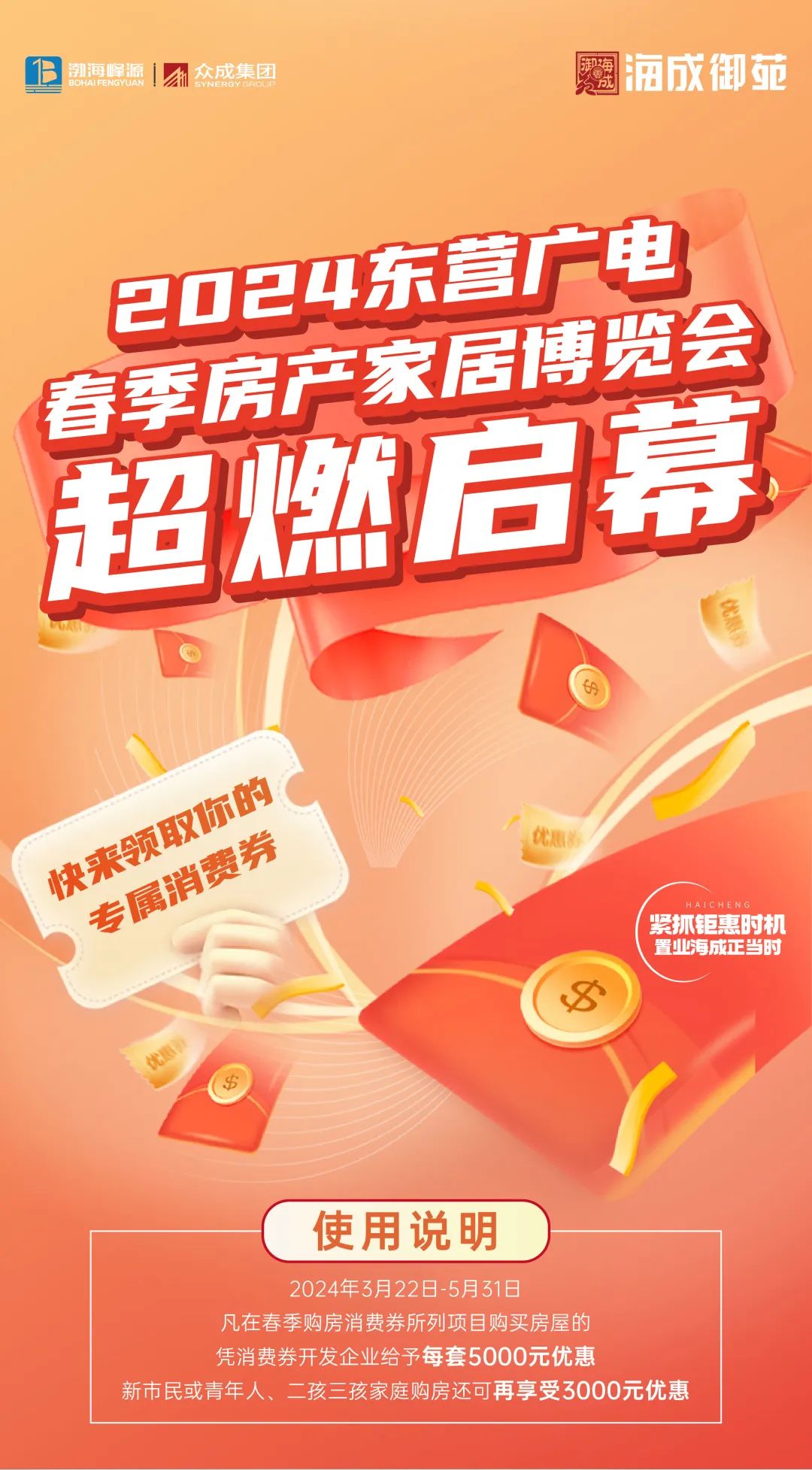 此次房产博览会为满足东营市民的购房需求,提高对于美好生活的热情,特别发放购房专属消费券!2024年3月22日-5月31日,凡在春季购房消费券所列项目购买房屋的,凭消费券开发企业给予每套5000元优惠,新市民或青年人、二孩三孩家庭购房还可再享受3000元优惠!紧抓钜惠时机,置业海成正当时!