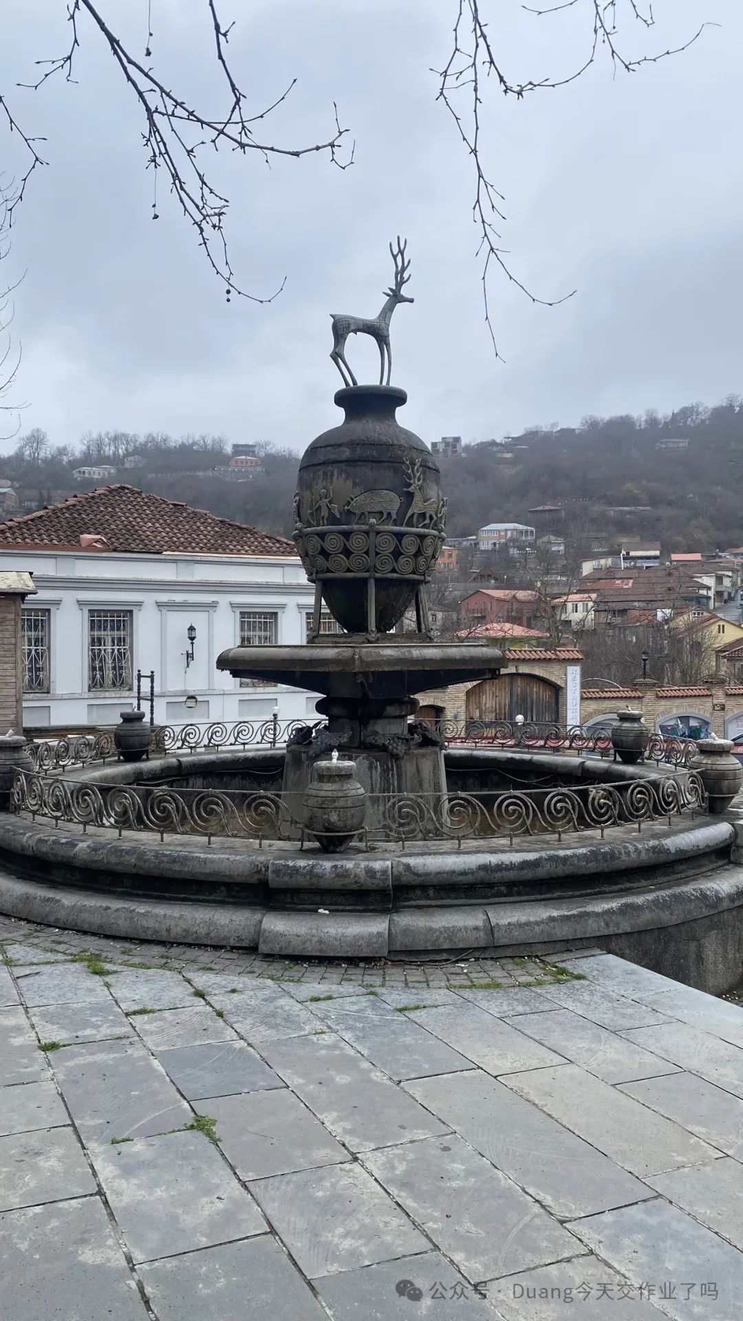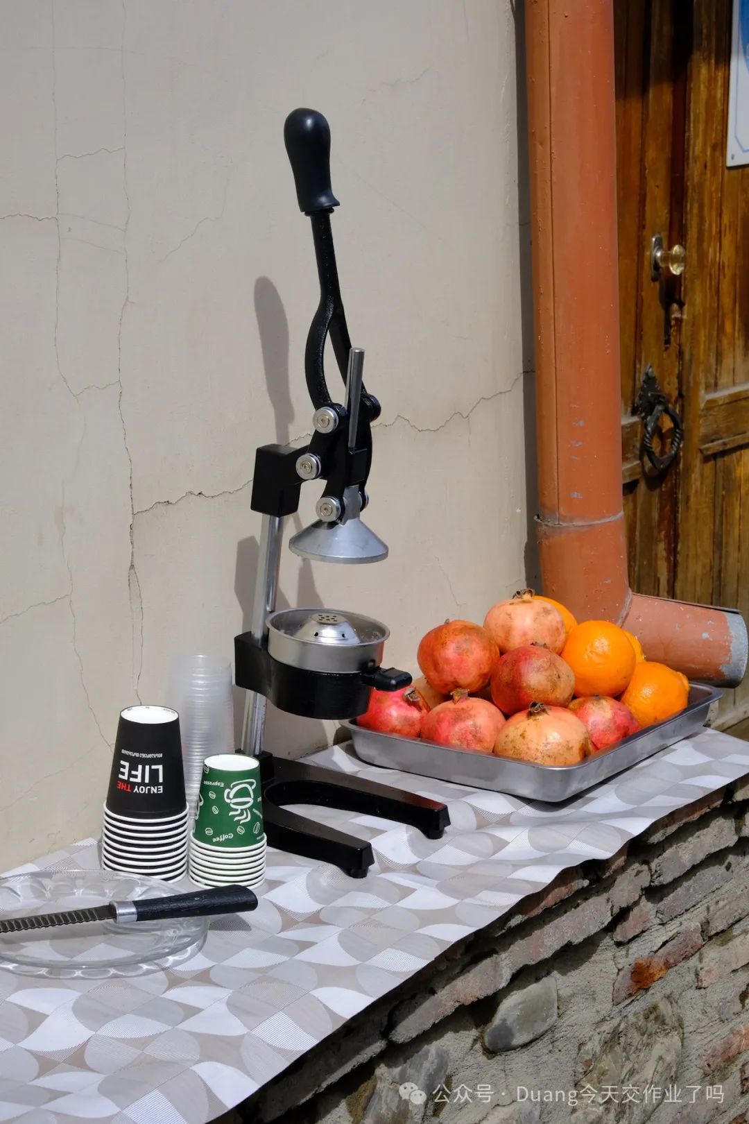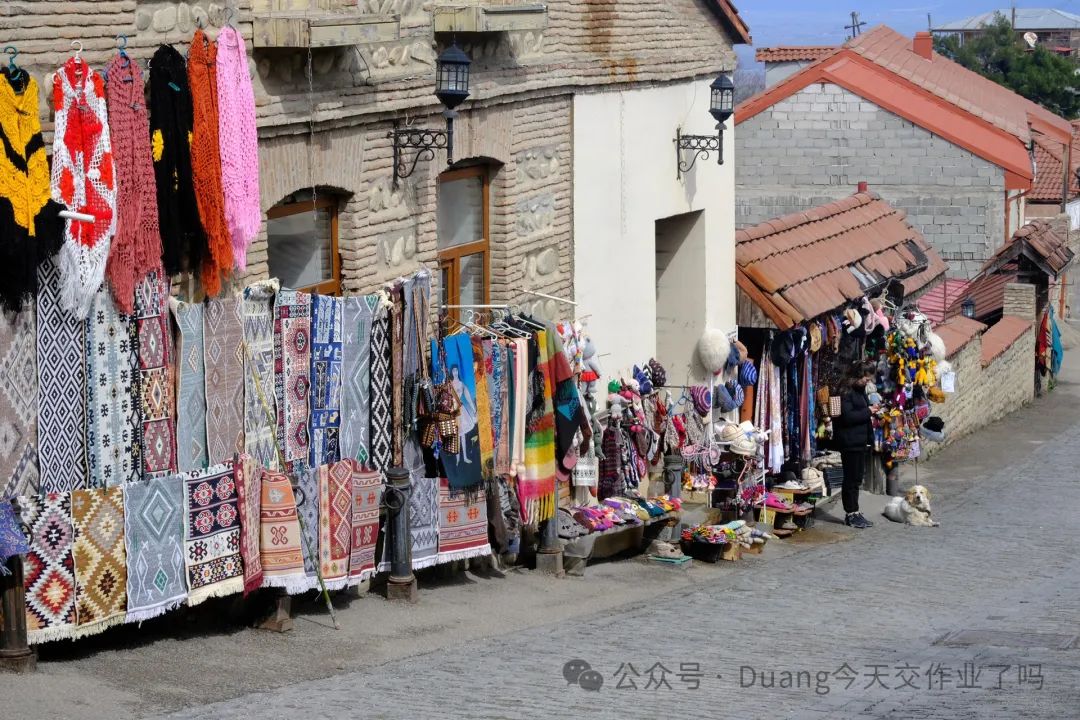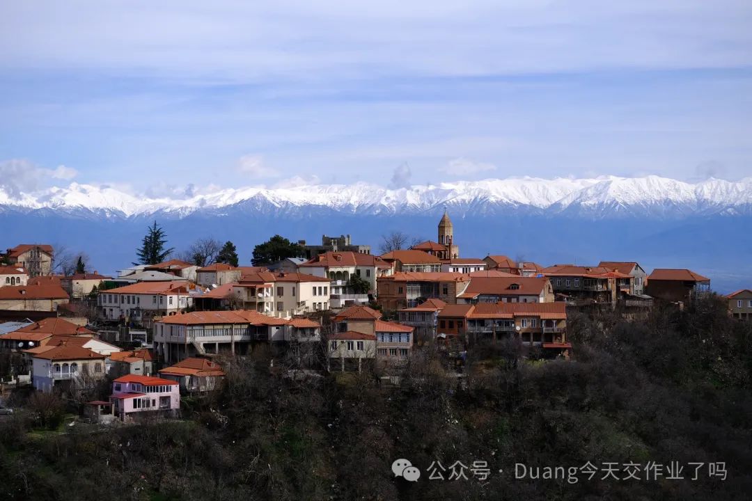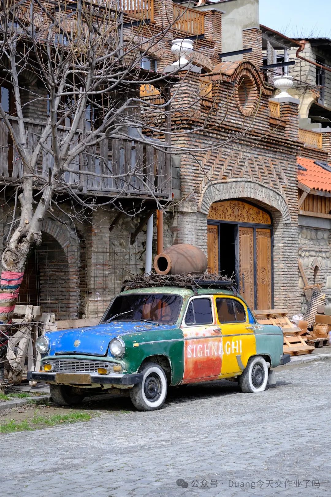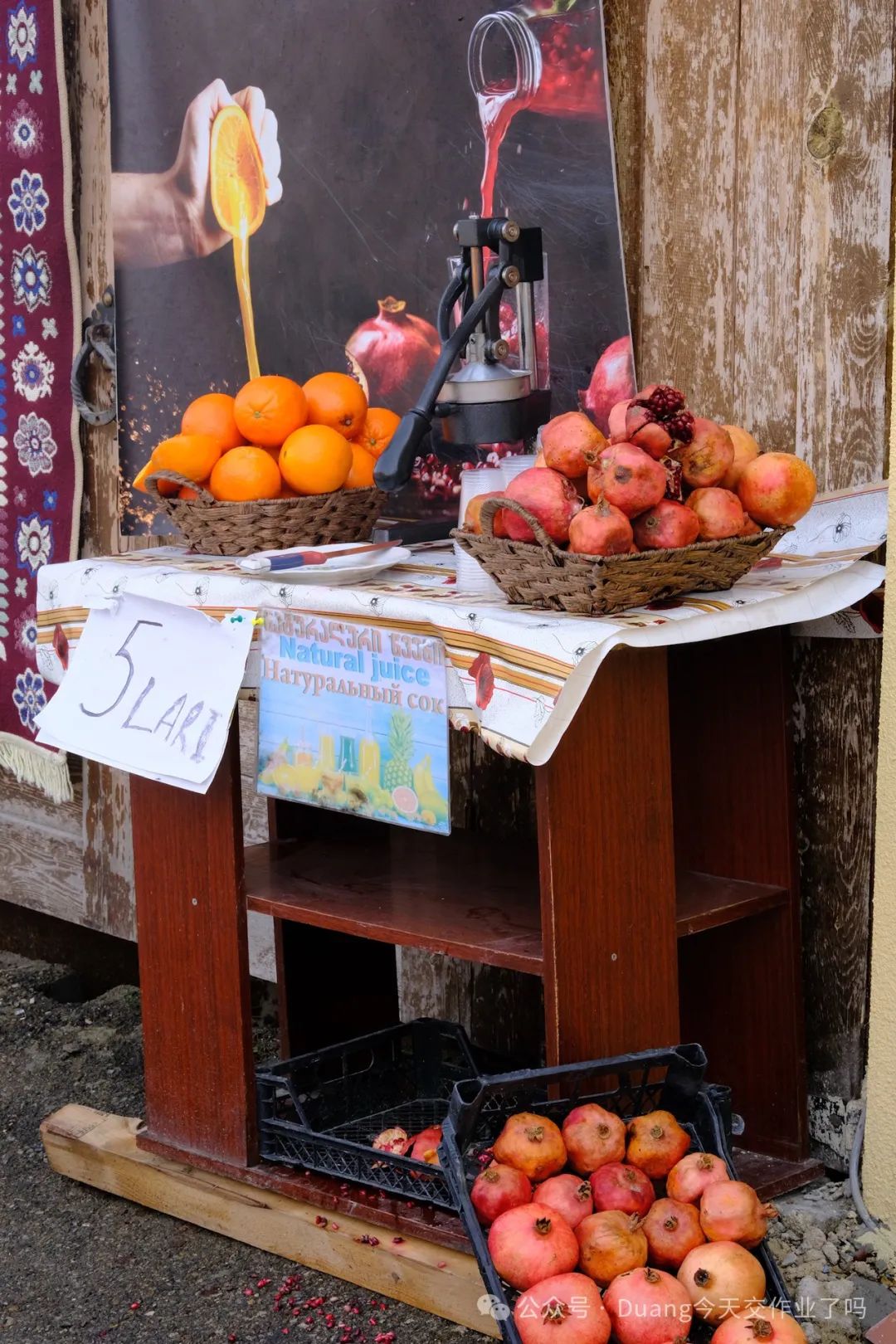 这里几乎家家户户都自己产酒,喜欢红酒的来到格鲁吉亚不可错过。西格纳吉很小,整个小镇1-2个小时就能逛完,可以选择当天来回,不赶时间的话建议可以住一晚,好好感受这里的慢生活。在进入小镇之前会路过一个观景台,可以俯瞰小镇全景,远处雪山就是高加索山脉。Sighnaghi Fountain,天冷喷泉没有开。旁边有一些观光车可以带着游览整个小镇。小镇市政厅,据说是24小时开放,可以领结婚证。(单身狗无法证实信息准确性)市政厅旁边的街心公园天气好的时候有老爷爷弹唱卖唱。市政厅旁边的阶梯往上走,是西格纳吉博物馆,票价20拉里。两层楼就4个展厅,一楼是出土的文物和风情民俗介绍,很小一点,最大的展厅是二楼的画,还有一个展厅是放了广岛原子弹爆炸的知识普及,十分敷衍,没有看头,不推荐!往前走有一家Cafe Medea,可以坐在观景位点一份红酒冰激淋,远眺高加索山脉和Signagi St. George basilica,店主知道当天是我生日还特意给我点的蛋糕上点了根蜡烛,一整个大感动。Signagi St. George basilica,当天没有开,只在外面看了一下。Sighnaghi Wall,可以爬上去感受下西格纳吉的长城烽火台。附近有好几家餐厅,绝对景观位,可以去感受一下,但味道不做评价。去了一家餐厅,Okro's Wine Restaurant & Cellar,自家产酒,跟店主说喜欢sweet口感的红酒,店主拿了几款出来尝,然而本人对酒一窍不通,实在享受不来,尝了几口就感觉上头,最后点了个grape lemonade。一个人点了面包+蘑菇汤+烤猪肉,面包泡汤,味道不咸(不咸已经是我对格鲁吉亚餐最高的评价了),但不建议点猪肉,非常硬且柴。小镇街道上有很多小店,卖一些工艺品,跟第比利斯的干桥市场里卖的东西都差不多。还有卖鲜榨石榴汁的,摊头就摆在路边,5拉里一杯,小贵。总的来说,如果时间不紧张,是一个非常适合留一天慢慢逛的地方,也许在第二天早上可以看到满天红的朝霞哦~