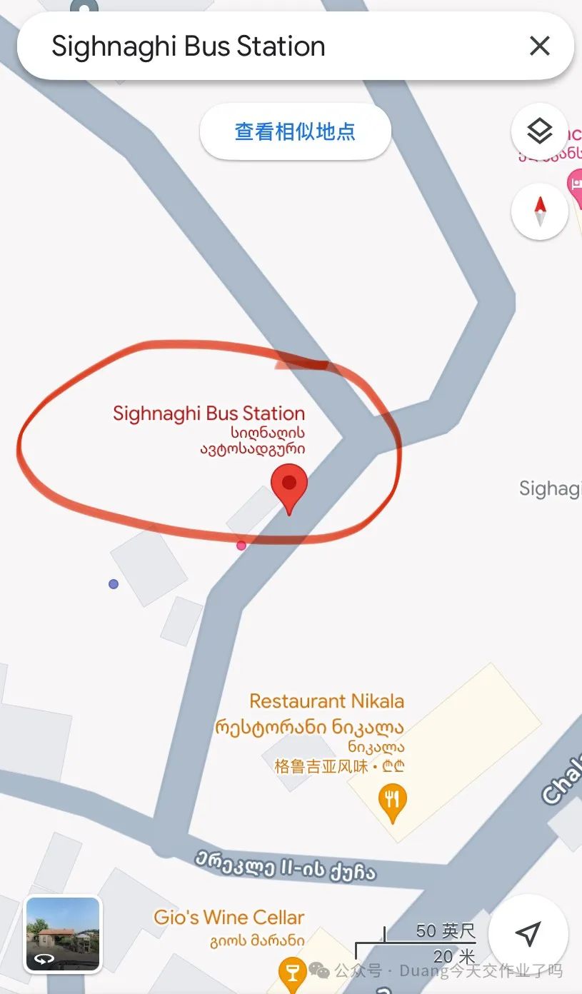 从第比利斯到西格纳吉,Google Maps定位“Samgori Bus Station”,跟着定位找就行。周边有好几个停车场停着去各个地方的mini van,找不到可以问一下停车场里的司机,会给指路。车前会放着牌子“Signagi”。