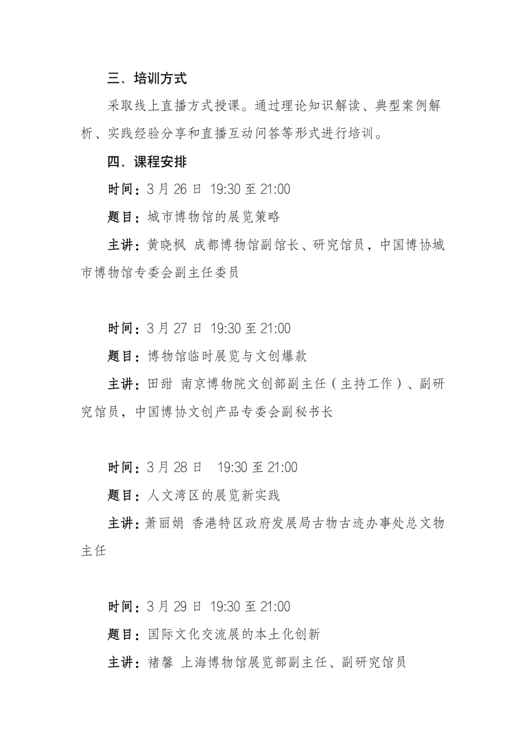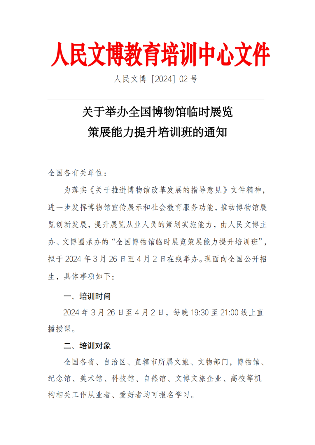 由人民文博主办、文博圈承办的“全国博物馆临时展览策展能力提升培训班”,拟于2024年3月26日至4月2日在线举办,培训班采取线上直播学习方式,邀请博物馆界展陈领域的专家学者授课,针对全国文物、博物馆、纪念馆、美术馆及相关文博文化单位等临时展览工作中的重点问题、典型案例的深度解析和经验分享,以此推动博物馆展览创新发展,提升展览从业人员的策划实施能力。