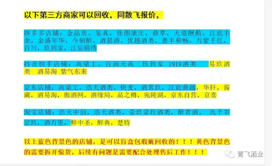 以下商家只收盲盒,根据发货地,日常报价减5-10回收 拼多多店铺:金品质 鼎萃 鉴真 江宸丰余 金盛年华 今朝醉 酒悬酒 快手店铺:高梁工旗舰店 天猫店铺:浩天中创 抖音店铺:玖到家 以上商家只收盲盒,拆开不要!!!只要快递盒子外观无破损,无酒味 儿,包瑕疵!!! |