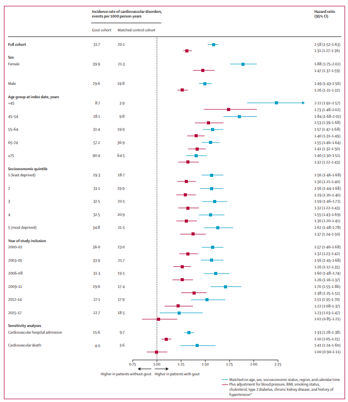 结果令人深思,在性别、年龄、社会经济地位和纳入研究年份等所有亚组中,痛风组的心血管疾病风险均高于对照组。
