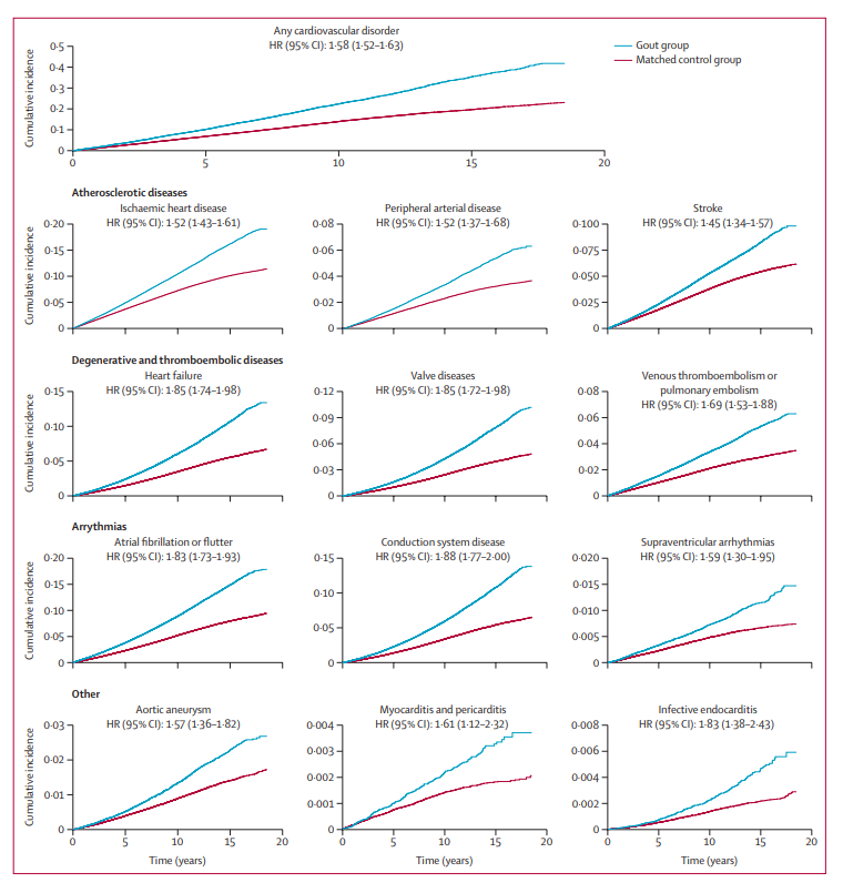 具体来看,结果令人揪心。与对照组相比,痛风组发生脑卒中的风险增高45%、缺血性心脏病风险增高52%、外周动脉疾病风险增高52%、主动脉瘤风险增高57%、心肌炎和心包炎风险增高61%、感染性心内膜炎的风险增高更加明显,高达83%。心律失常的风险也显著升高,痛风组房颤或扑动风险增高83%、传导系统疾病风险增高88%和上室性心律失常风险增高59%。发生静脉血栓栓塞或肺栓塞的风险增高69%,心力衰竭风险增高85%,及瓣膜疾病风险增高85%。