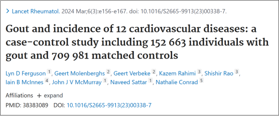 [1] Ferguson LD, Molenberghs G, Verbeke G, et al. Gout and incidence of 12 cardiovascular diseases: a case-control study including 152 663 individuals with gout and 709 981 matched controls. Lancet Rheumatol. 2024 Mar;6(3):e156-e167.