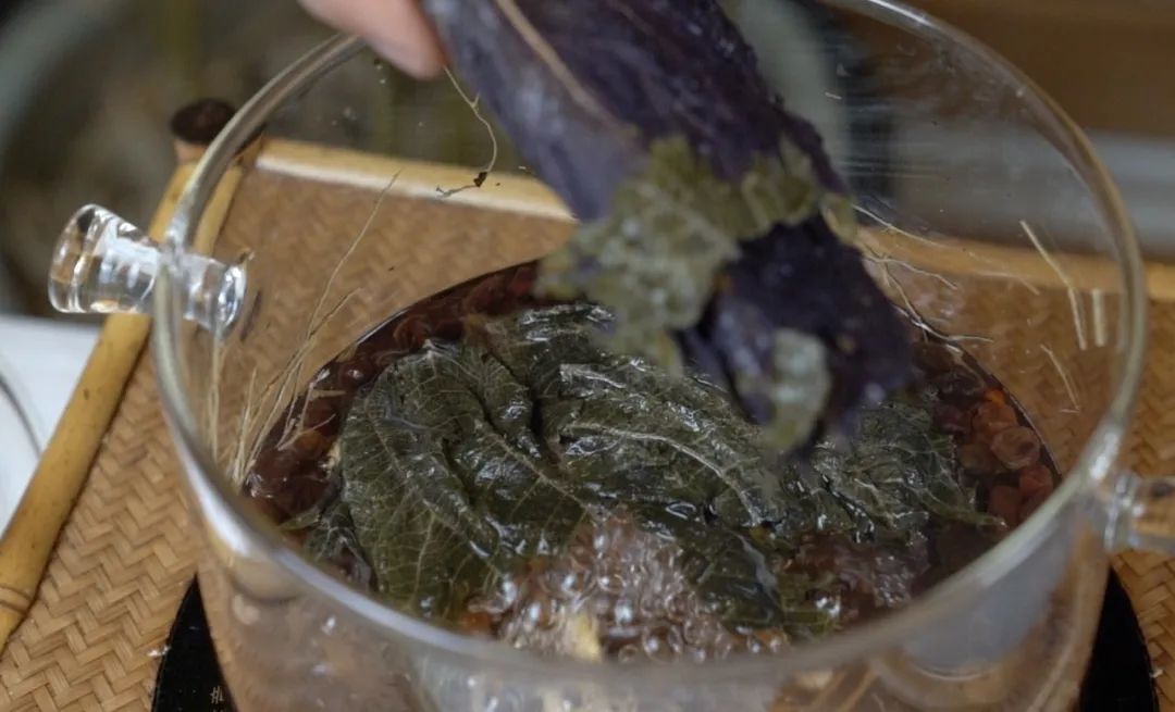 4.把水煮到差不多还有二分之一的时候,加入紫苏叶