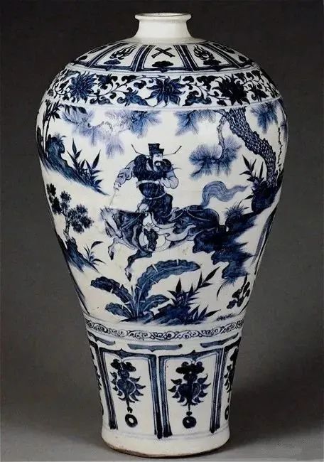 造型端庄挺秀,腹部绘制“萧何月下追韩信”历史故事,萧何、韩信和艄公的形象绘制的富有个性,并以松、竹、梅、芭蕉、山石为背景,形象生动地展开了一幅历史画卷。画面之外配有五组纹饰带,整个梅瓶装饰繁缛,纹饰带布局疏密有致,是元末明初青花瓷器中的精粹之作。