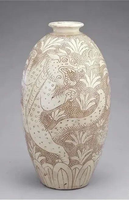 瓶形似橄榄,圈足。胎为灰褐色,施白色化妆土。瓶身刻划二虎,一站立,一行走,呲牙翘尾,均矫捷凶猛, 搏斗于草丛中,衬以洞石、芭蕉,近底处有一周莲瓣纹。图案以外空白处戳印珍珠形小圆圈。