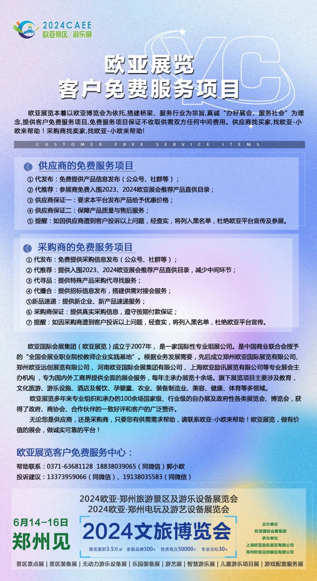 展会3天时间里,发放门票累计10000+份。2024欧亚游乐展是一场大型游乐设备行业交流合作盛会,将于6月14日-16日在郑州国际会展中心举办,展示面积3.5万+平米、预计参展企业将突破500家,专业观众5万+人,展会将展出将展出景区装备、无动力游乐设备、乐园游乐设施设备、商业游艺、民宿露营、智慧文旅、智慧游乐、文旅配套及服务等。