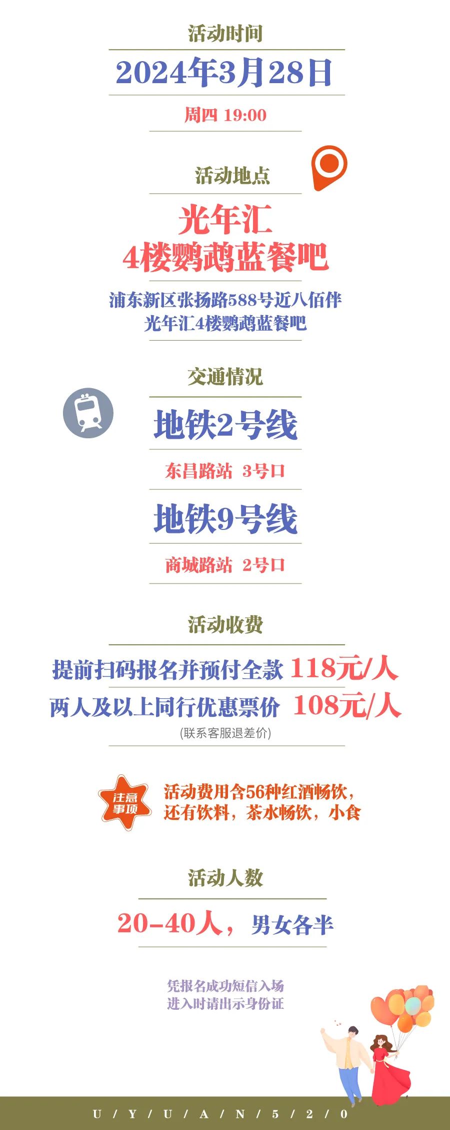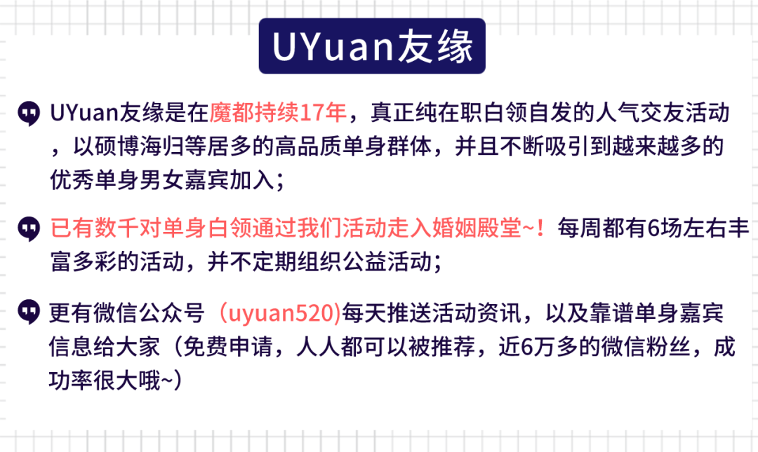 ? 因活动要求男女比例一致,请大家报名前务必考虑清楚,一旦报名请务必准时出席哦~如有意外情况不能参加请至少提前一天告诉我们,我们不欢迎鸽子哦~谢谢!