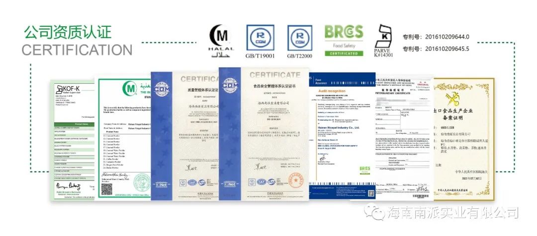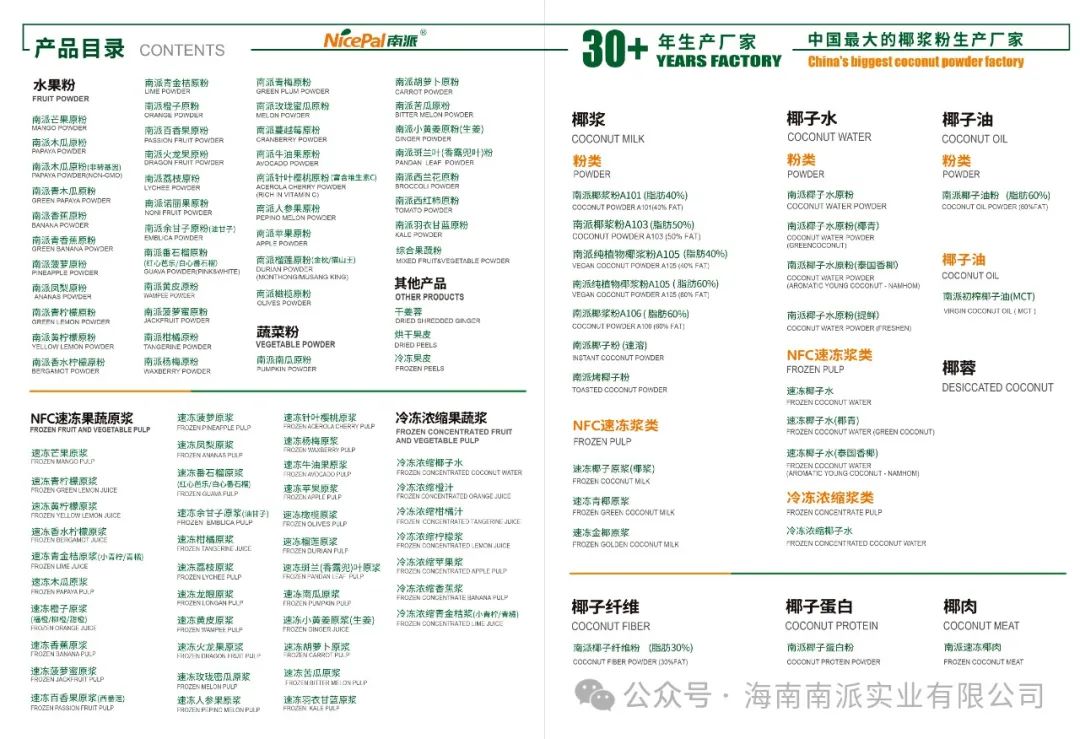 南派实业自主研发和生产的“南派”品牌旗下的系列产品分为五大类:1、果蔬原粉类——椰浆粉、芒果原粉、木瓜原粉、菠萝原粉、香蕉原粉、南瓜原粉等;2、果蔬粉应用类——烘焙果蔬粉系列、椰子纤维粉系列等;3、速冻浆类——速冻椰子原浆、速冻芒果原浆、速冻调配浆;4、冷冻浓缩果汁类:冷冻浓缩橙汁、冷冻浓缩椰子水、冷冻浓缩菠萝汁、冷冻浓缩柠檬浆等;5、椰蓉制品类;6、常温水果浆类。以上五大类产品品种多达上百种,以满足市场多领域的需求。优质产品需从源头抓起,公司还自有可控的水果基地1万多亩,统一规范的种植管理技术,保证水果原料的质量、安全和可追溯性,同时可确保生产所需原料的供给,以满足市场大批量的需求。
