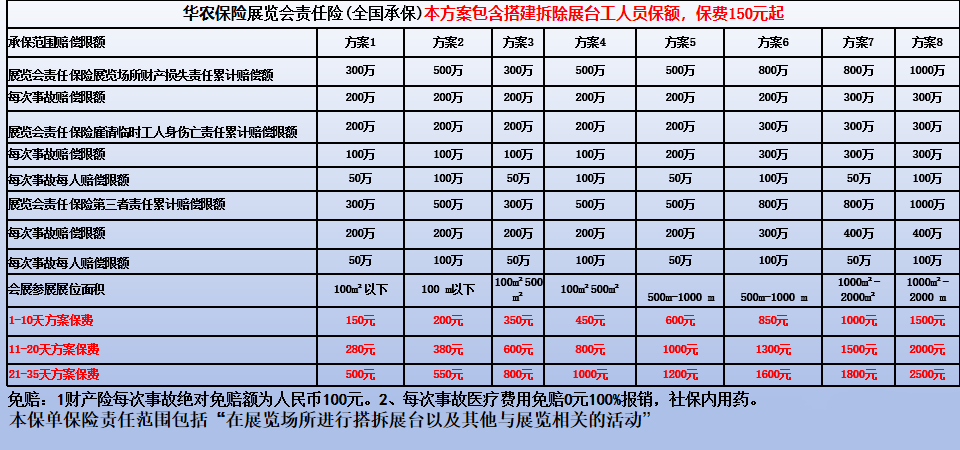 展览会责任险,保障的是整个展览会,需要根据面积、保额要求、承保时间以及特别约定需求来测算保费,一般是由主办主承方来投保。建议展台搭建前一天投保!