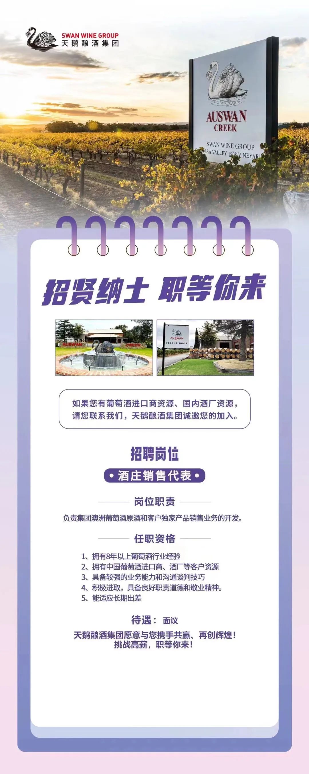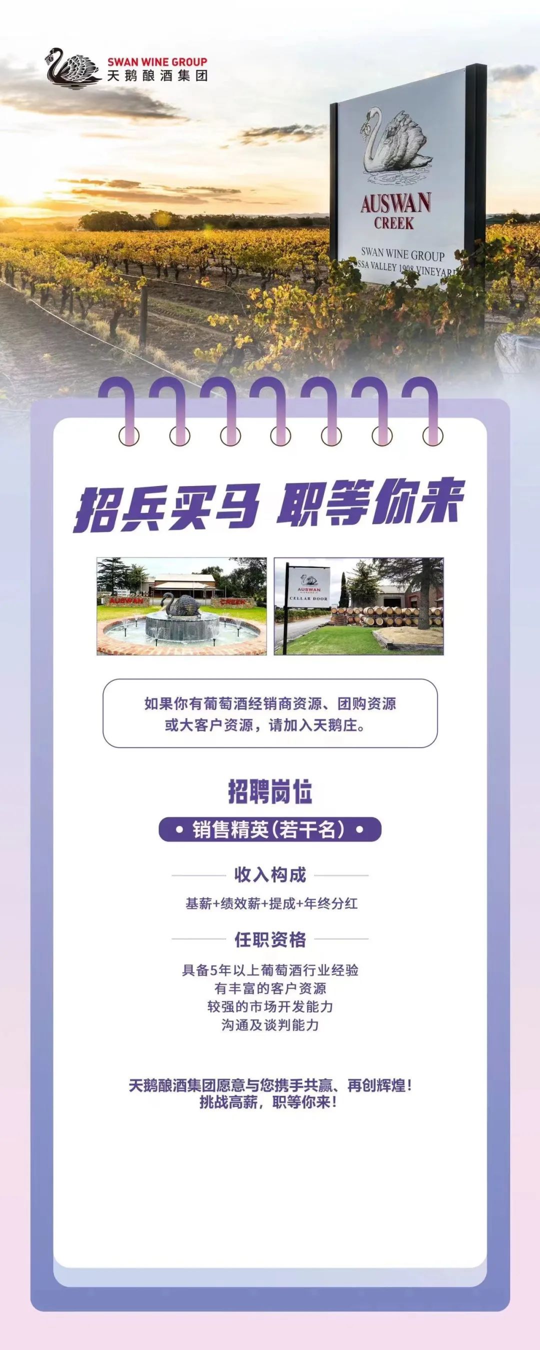 天鹅酿酒集团是一家全球综合性酒类运营集团,集葡萄种植、葡萄酒和酱酒酿造、大健康、品牌塑造及市场营销等核心业务于一身。集团于2010年在澳大利亚悉尼成立,在“立足亚太、聚焦中国、放眼世界”的全球战略引领下,集团于2012年进入中国市场,2020年成立新加坡分公司,经过多年不懈努力,现已将旗下天鹅庄打造成中国市场前三的知名澳洲葡萄酒品牌。