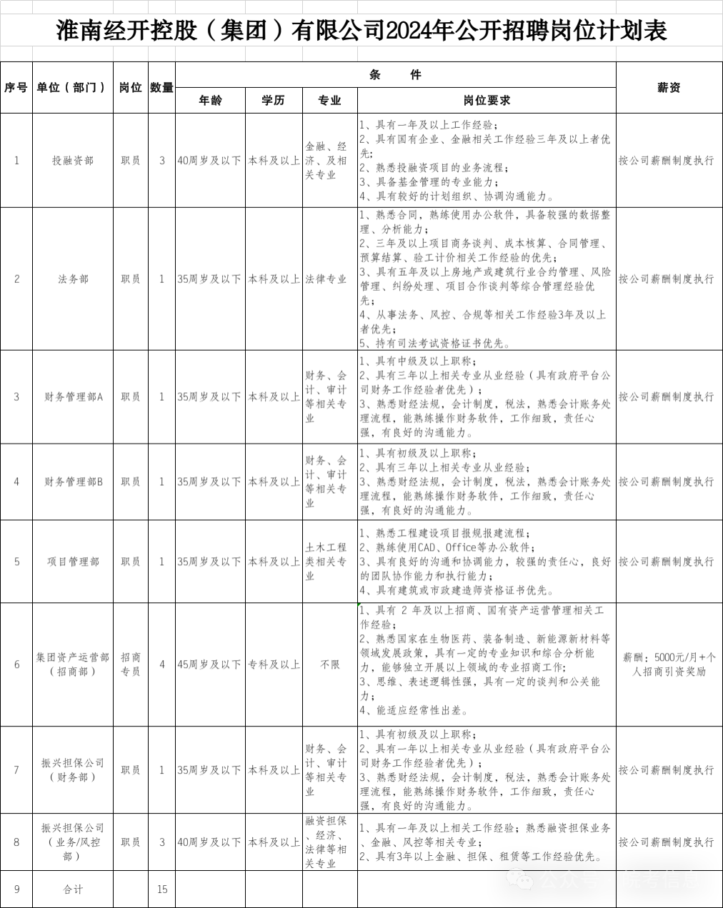 本次招聘岗位及条件详见附件《淮南经开控股(集团)有限公司2024年公开招聘岗位计划表》。