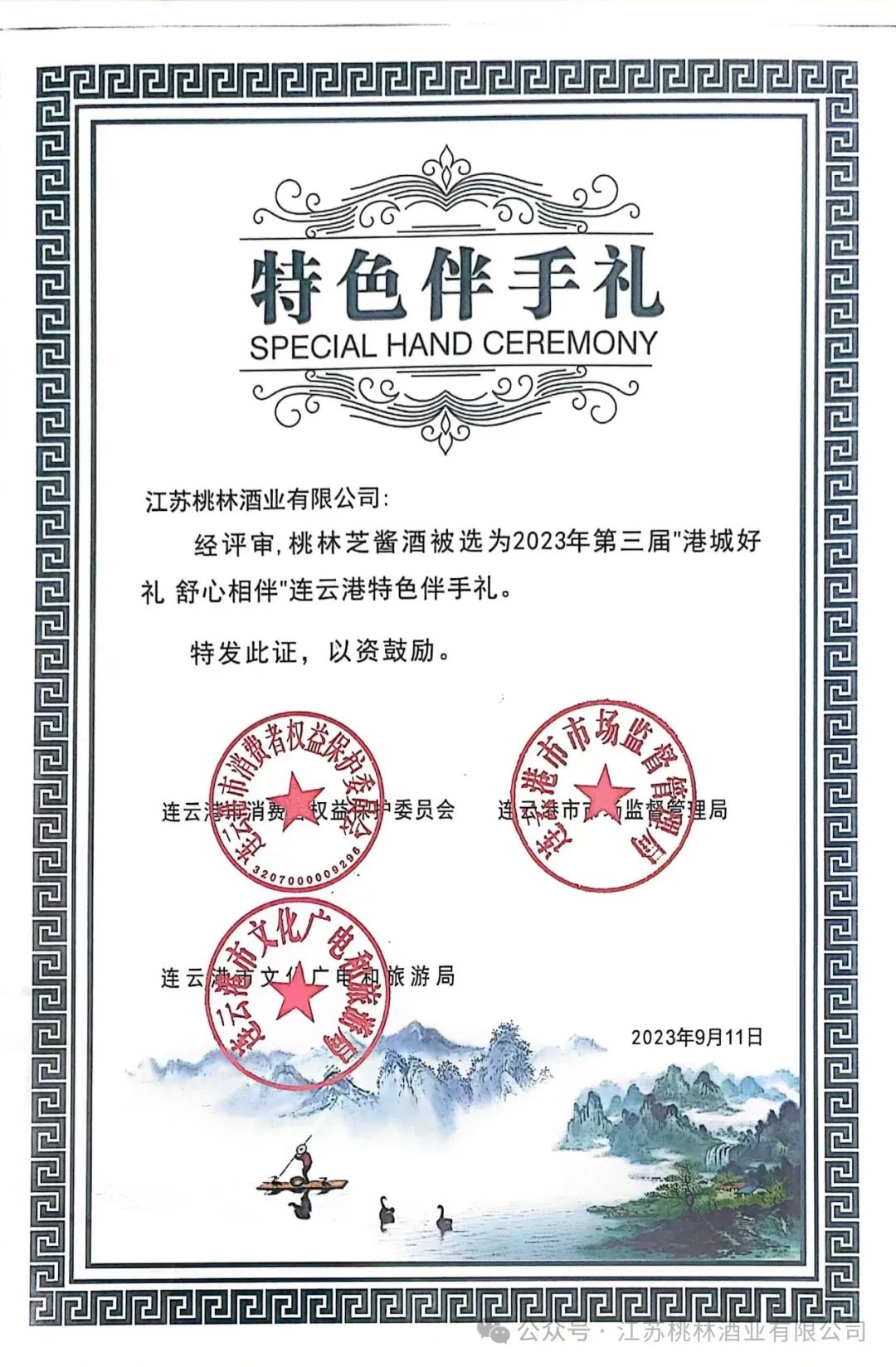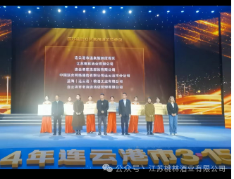 日前,连云港电视台隆重举行颁奖仪式,桃林酒业被江苏省市场监管局评为“江苏省放心消费示范企业”,桃林芝酱白酒被评为第三届港城好礼“连云港特色伴手礼”。桃林酒业总经理马林代表公司上台领奖。