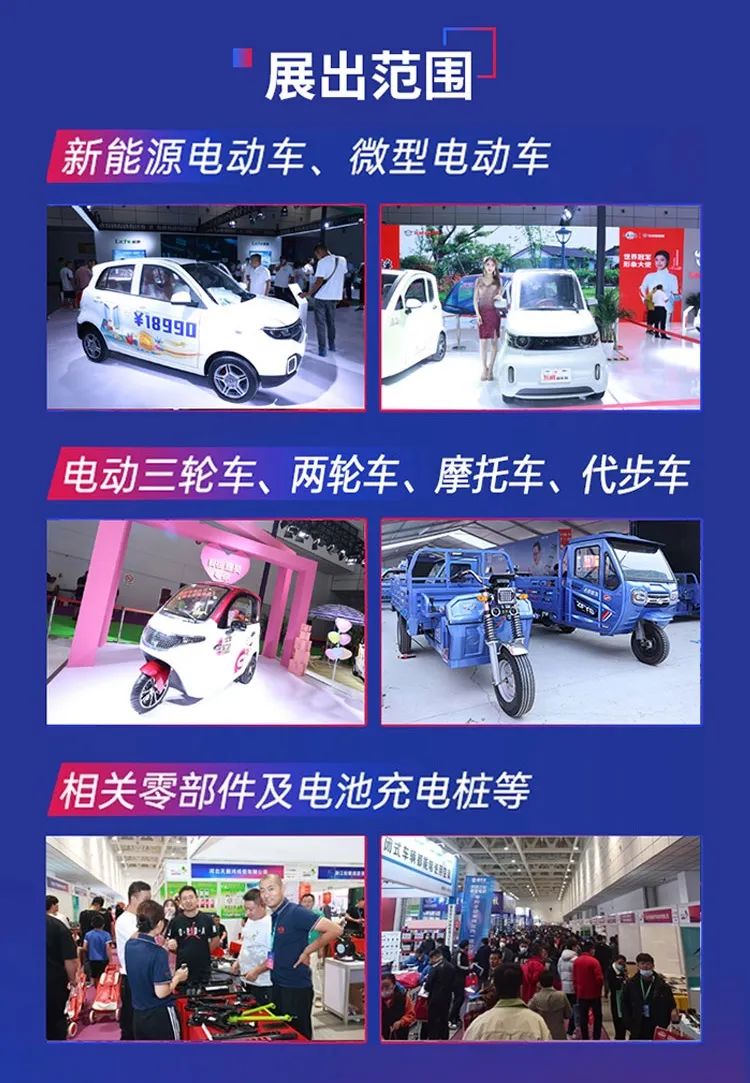 展品覆盖集各种新能源电动车、微型车、四轮车、三轮车、两轮车、摩托车、代步车、休闲车、各种电池、电机、电控、充电桩、零部件等,让您一站了解行业发展新趋势,形成了一个全产业链综合展示的窗口。