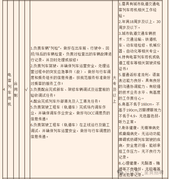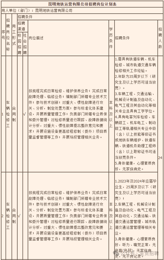 本次招聘涉及电客列车司机、检修工等多个岗位,具体招聘岗位、人数、资格条件等详见《昆明地铁运营有限公司招聘岗位计划表》(附件1)。