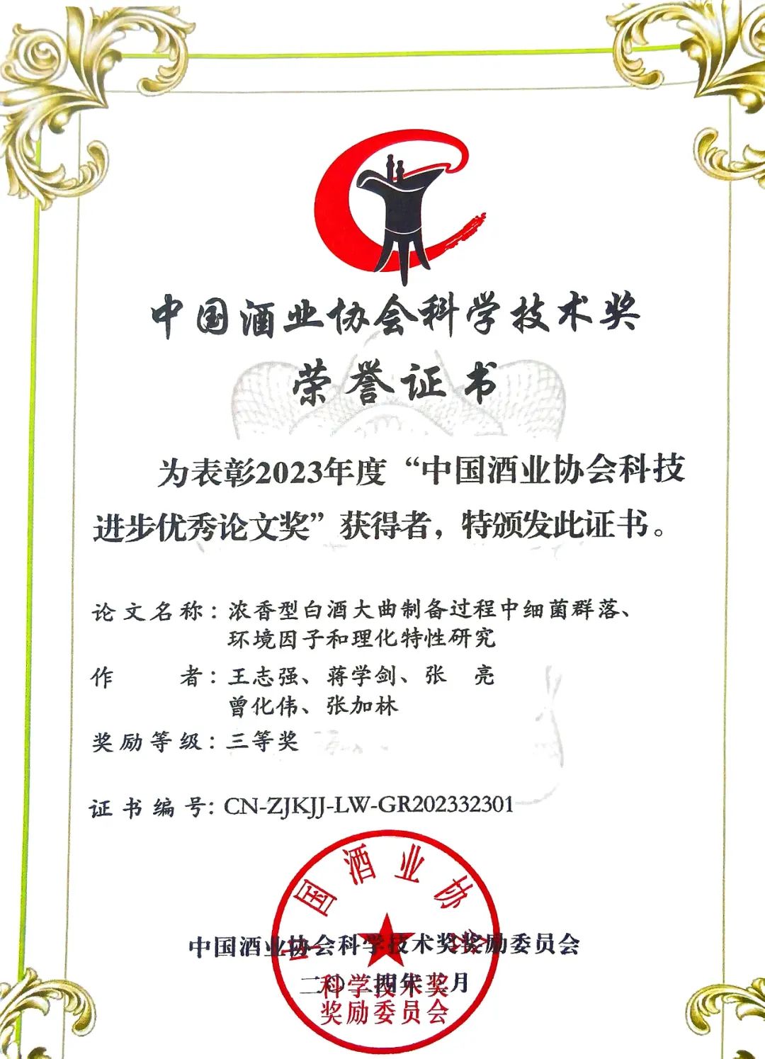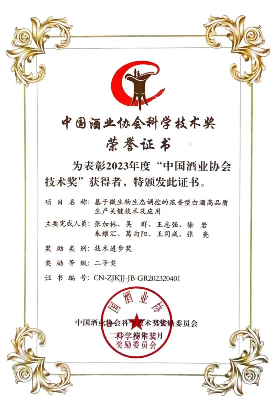 汤沟酒业两项科研技术成果荣获2023年度“中国酒业协会科学技术奖”