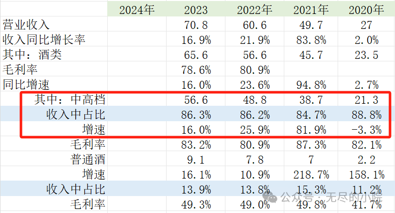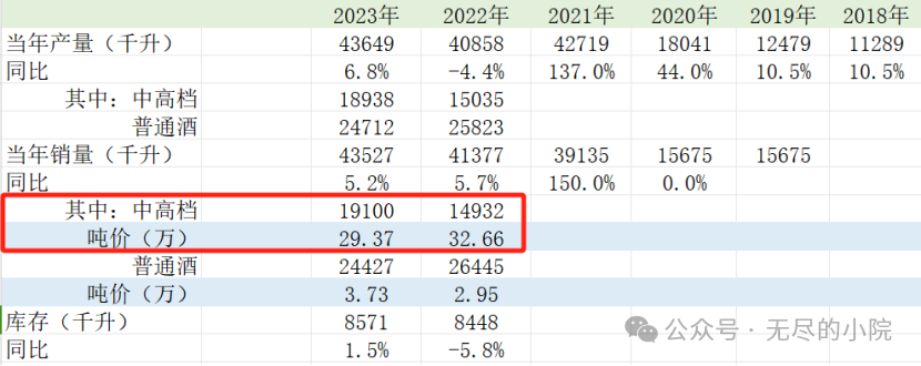 如上图所示,2023年销量同比增加5.2%,多卖了2000多吨,但是在公司收入中占比高达86%的中高档酒,呈现出明显的量增价减的情况。2023年吨价29.4万,同比下降约10%。 吨价下降意味着厂家出厂价降低。但如今名酒企业们都学聪明了,深深明白,想要长期发展必须坚守产品的中高档酒定位。