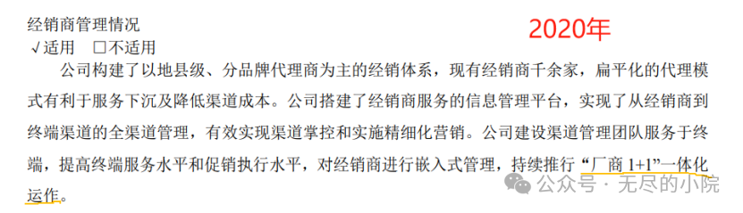 2020年开始“经销商管理情况”小节的阐述中,将渠道模式直接描述为“厂商1+1”一体化运作模式。