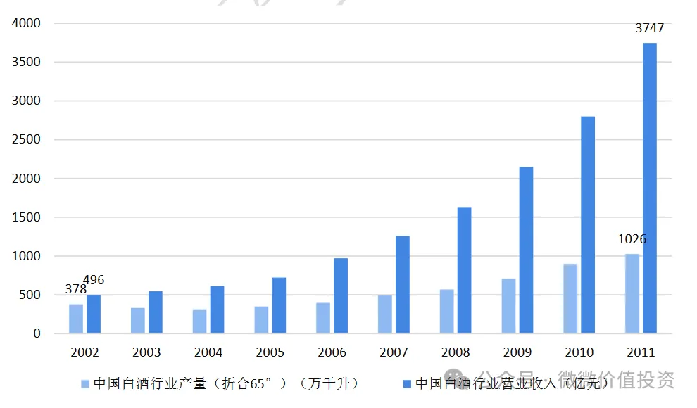 2002-2011年:白酒产业发展进入黄金时代。自我国加入世贸组织以来,经济迅速崛起,居民的消费水平也不断攀升。随着市场环境的逐步成熟和各项制度的稳定,白酒行业迎来了长达十年的黄金发展期。据国家统计局数据,从2002年到2011年,我国白酒行业的收入从496亿元激增至3747亿元,实现了近七倍的增长。