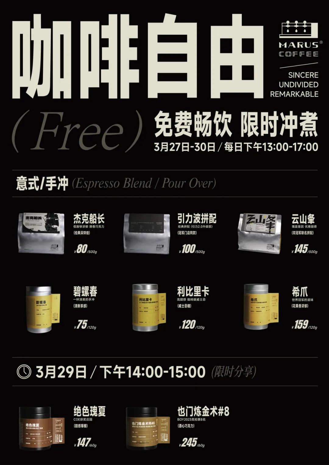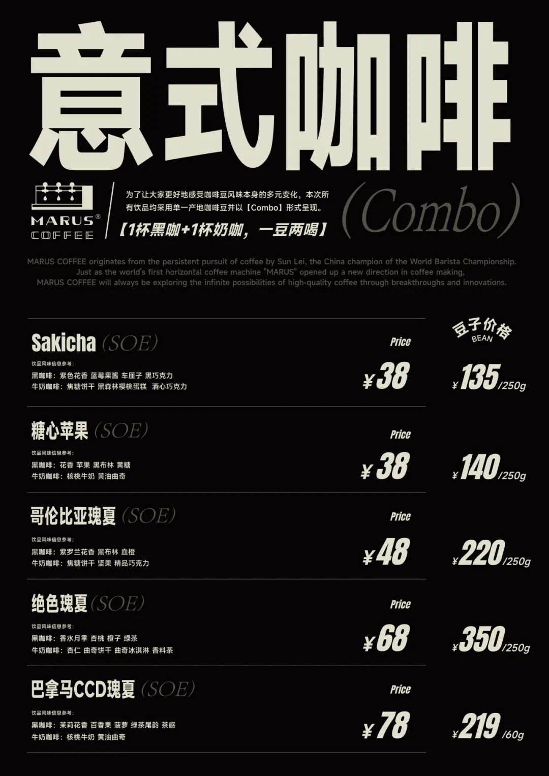 与以往一样我们仍将以Combo的形式进行意式咖啡的出品,一豆制作美式+奶咖两种饮品,展示一支豆子的多样风味变化;同样我们也准备了近期上新的几款手冲咖啡与大家分享。所有现场售卖的饮品基本都可在现场GET同款咖啡豆,以及享受满减优惠,期待你们的打卡评鉴!