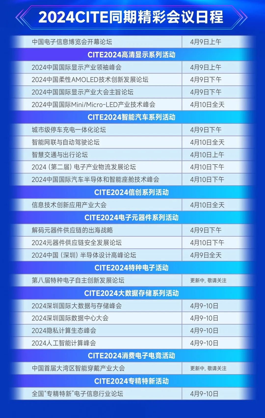 2024电博会展示面积将达10万平方米,将汇聚全球各地超1500家参展企业和超10万名专业观众,电博会集中展示了中国电子信息产业链的完整性,设立了CITE品牌创新主题馆、新型显示及应用馆、消费电子生活生态馆、国防军工电子馆、汽车电子与智慧物流馆、电子信息产业应用馆、基础电子馆、光储充主题馆、电子竞技智能科技馆 9大展馆,聚焦智慧家庭、新型显示、高端半导体、信创、大数据与存储、国防军工、人工智能、绿色消费电子、基础元器件等行业热点,向全球展示中国电子信息产业的新产品、新技术、新服务、新模式、新趋势、新理念。