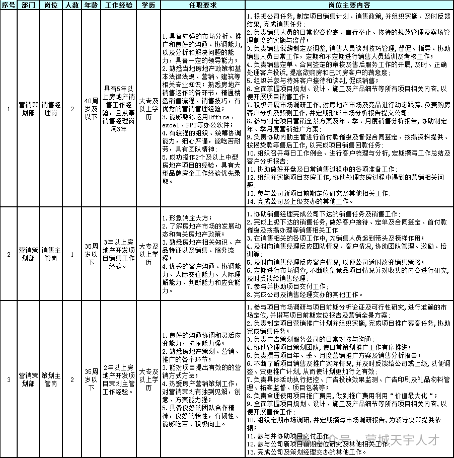 本次共招考销售经理岗2名、销售主管岗1名、策划主管岗2名。具体招考岗位见岗位计划表。