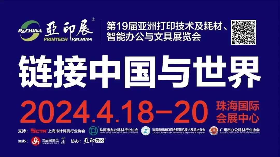 ReChina亚洲打印技术及耗材展览会,于2004年创立于上海,并连续18届在上海和深圳成功举行。近二十年来,为数以万计的全球打印、办公及耗材行业厂商提供交流交易和品牌传播服务,影响深远。第19届亚印展,由上海市计算机行业协会、珠海市打印设备及耗材行业协会、珠海市进出口商会复印机技术及耗材分会和广州市办公耗材行业协会等支持,上海龙品锡展览有限公司主办、珠海龙品锡亚印展览有限公司承办,亚印办公合办。同期举办,2024中国打印技术及耗材营销论坛、2024亚印展新品发布会等论坛及活动。