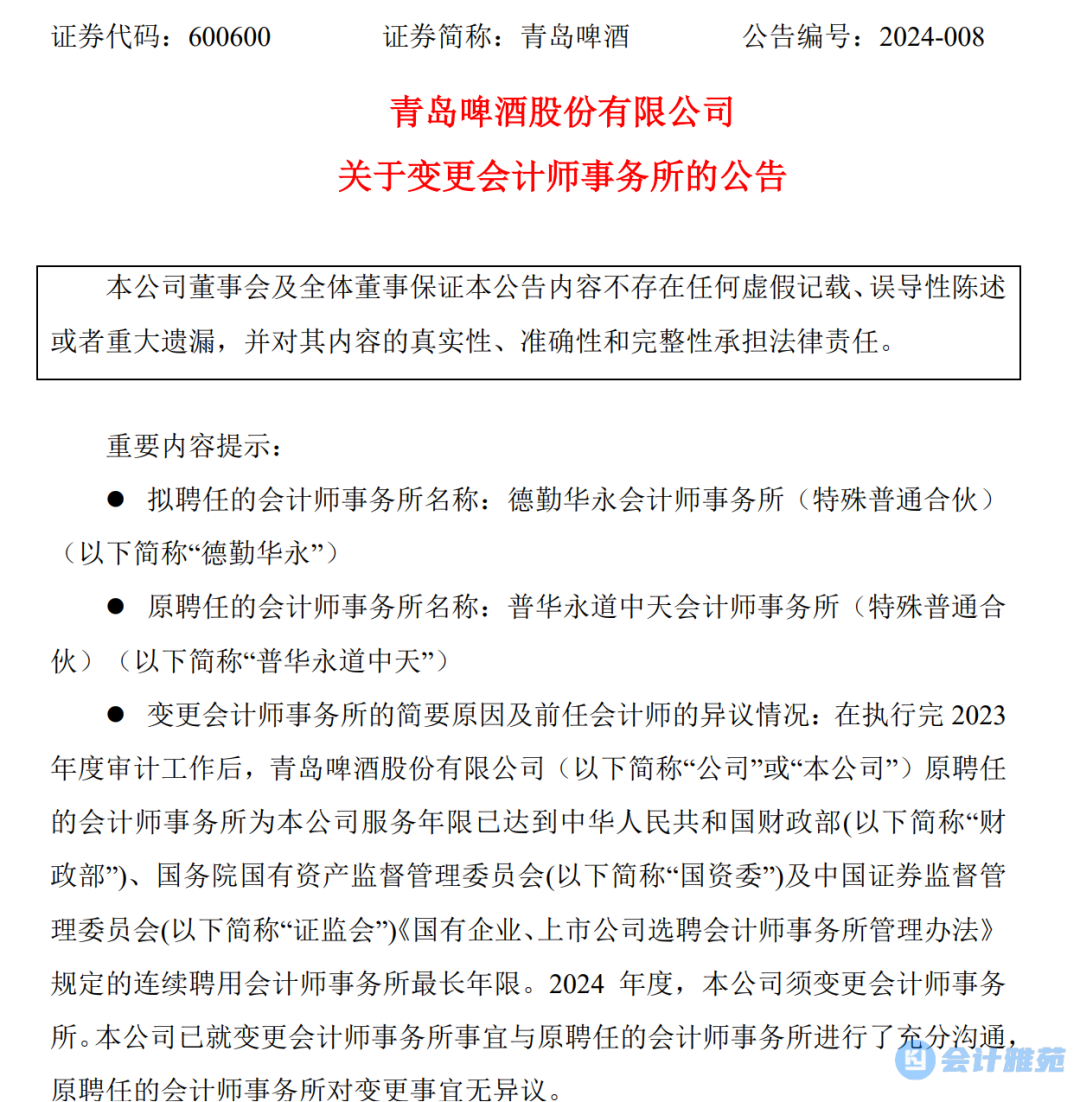 普华永道连续服务22年!青岛啤酒更换会计师!审计费下降22.38%!
