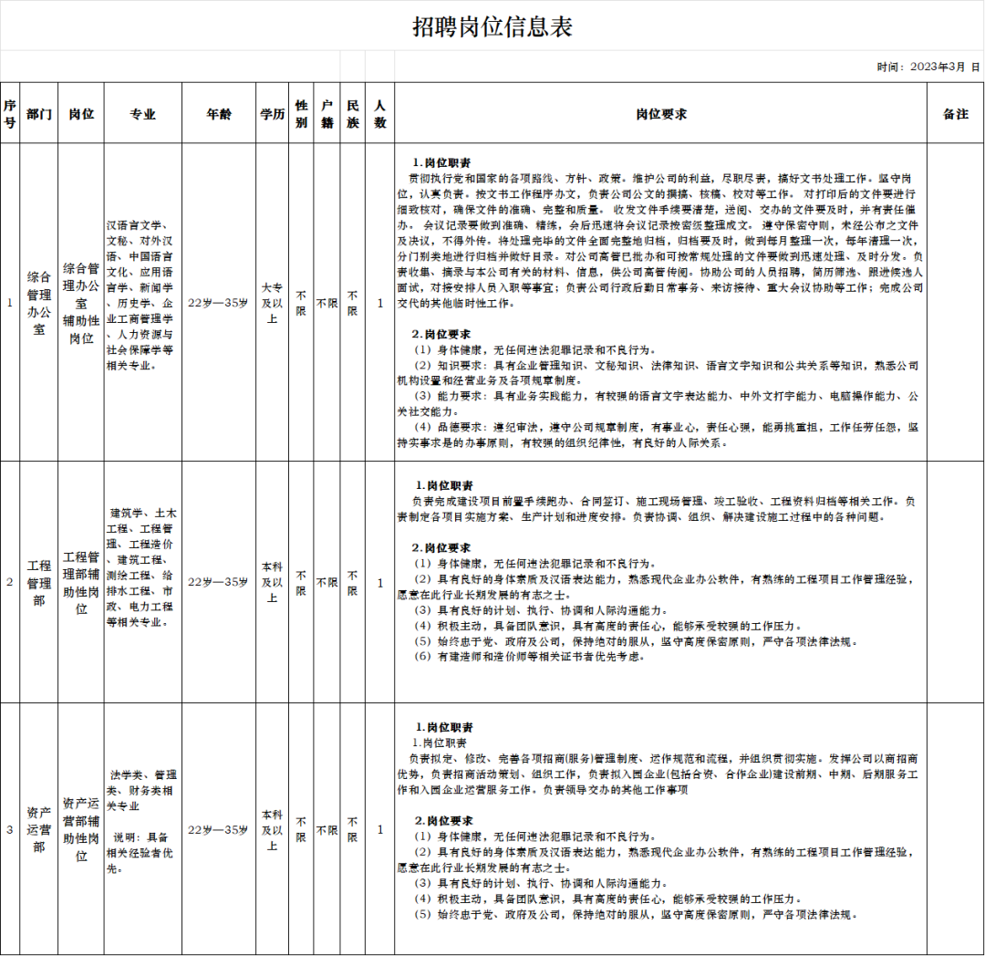 招聘岗位及要求详见《招聘岗位信息表》(附件1)