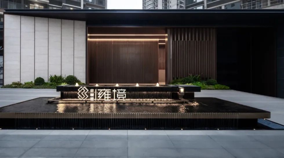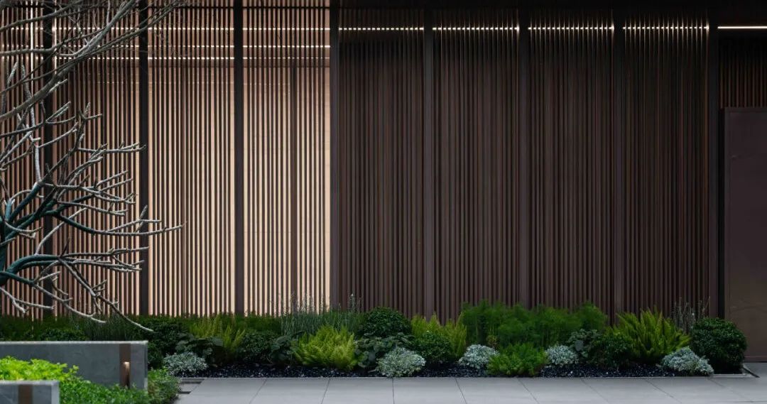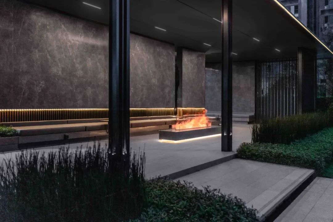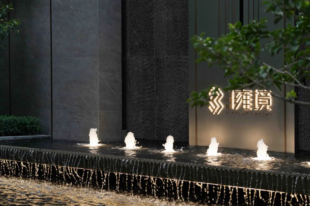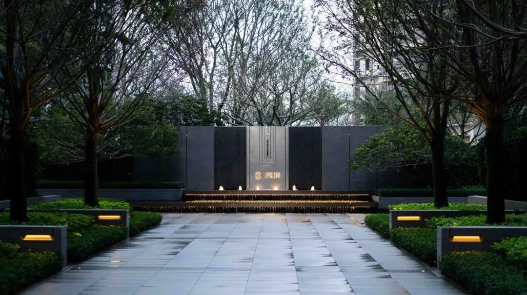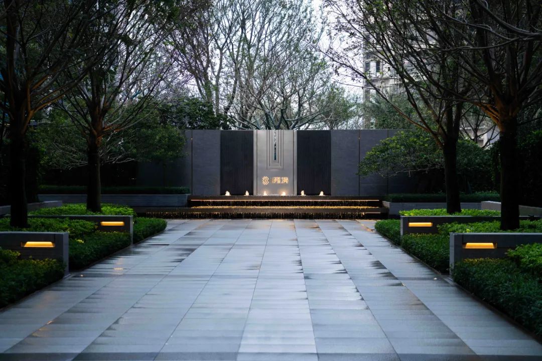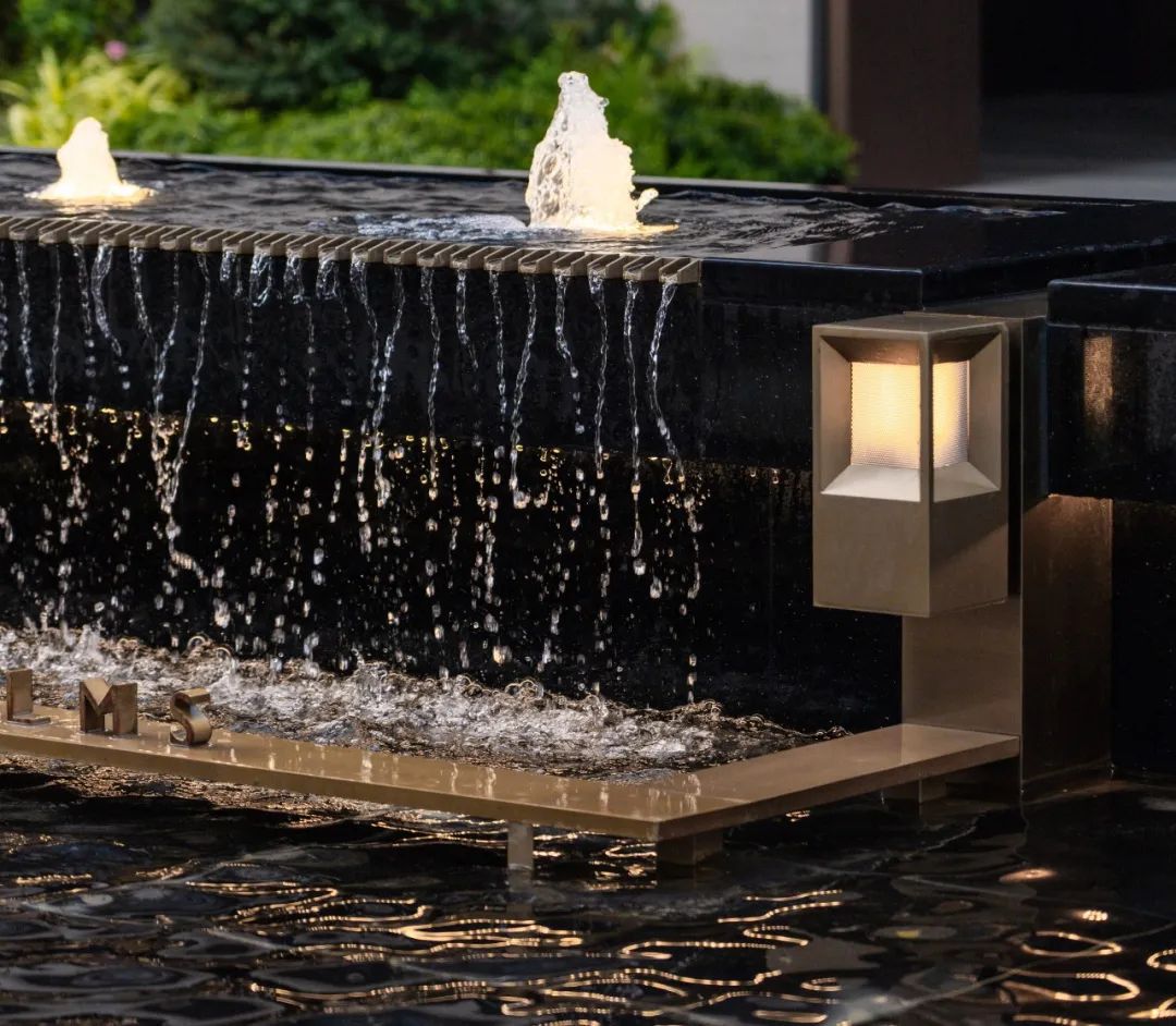 步道尽头,黑色的水幕墙无声地流趟着水的姿态,一棵造型优美的铁冬青摇曳生姿,极尽格调与意趣。精致的景墙与细腻的叠水结合形成视觉焦点,引导业主从视觉空间到心理感受上,从外部环境的繁华热闹“转场”为内部空间的品质宁静,营造秩序奢华的归家体验。