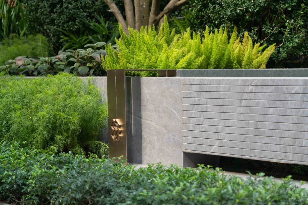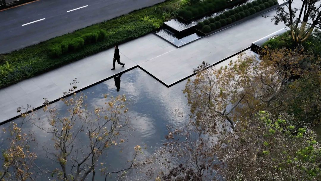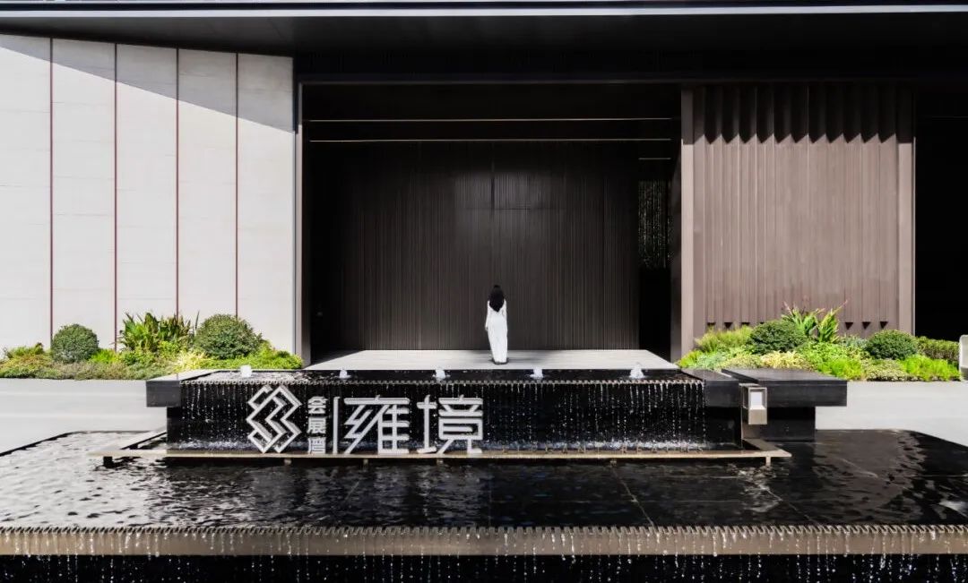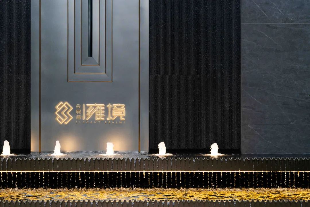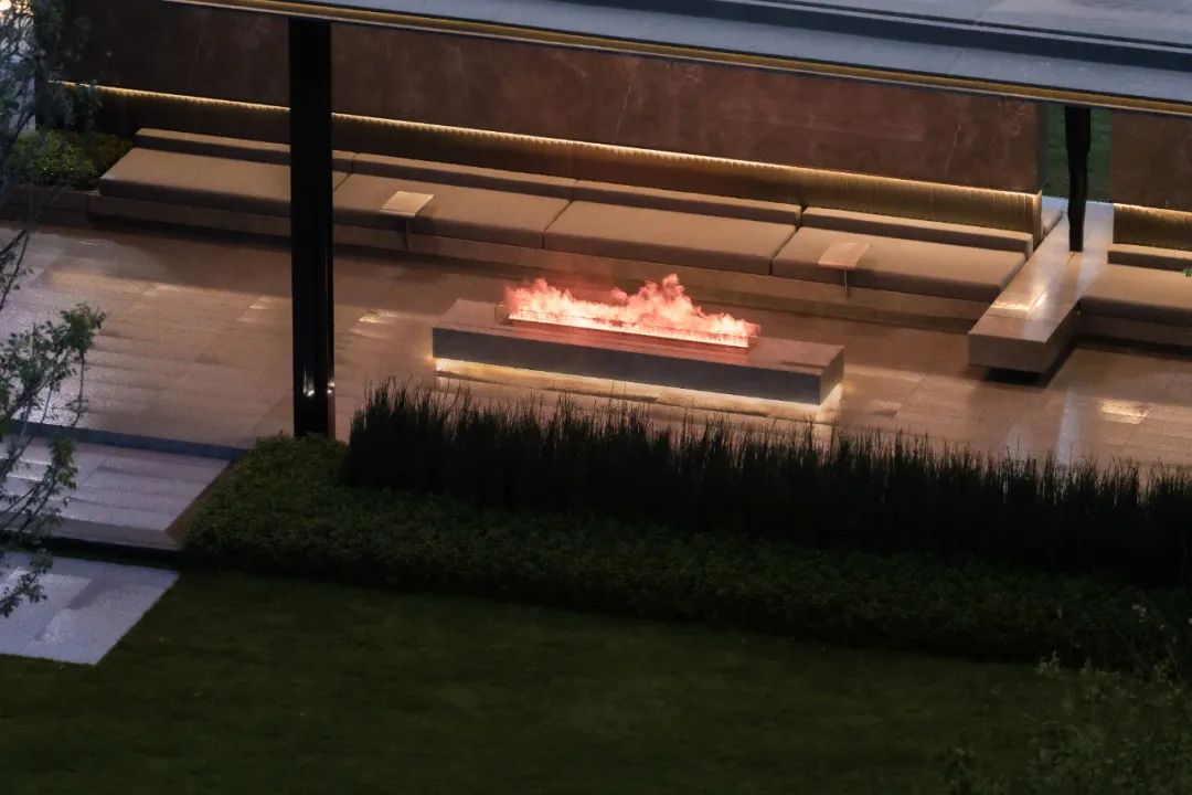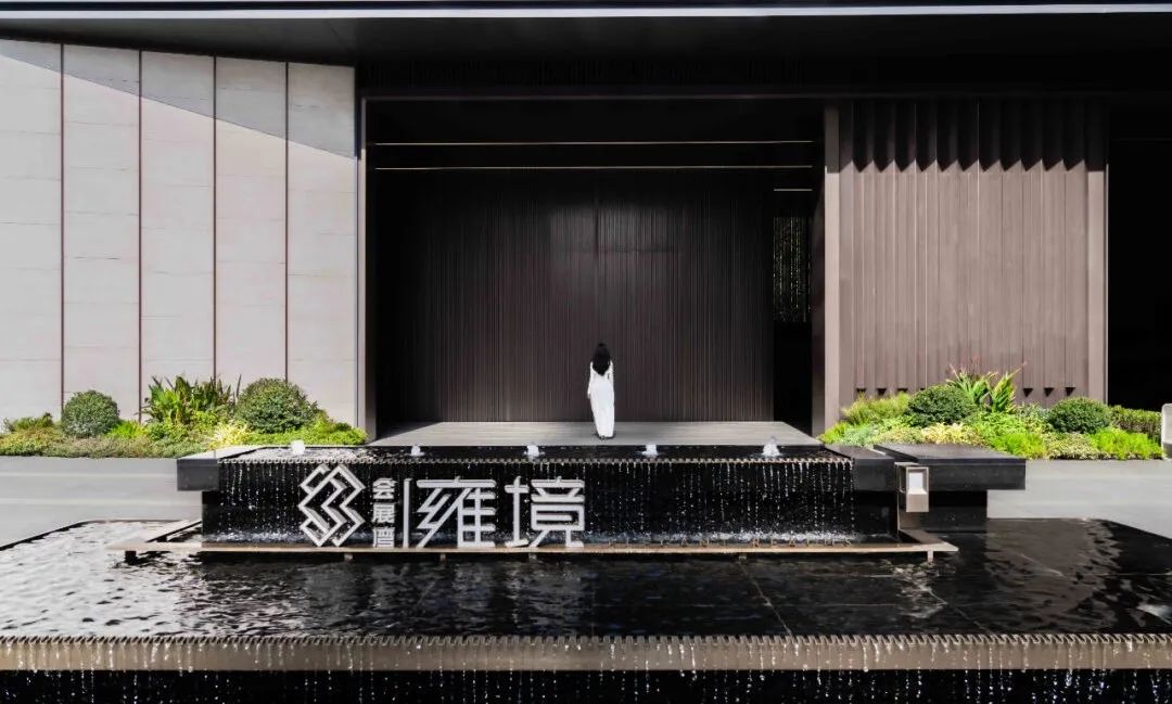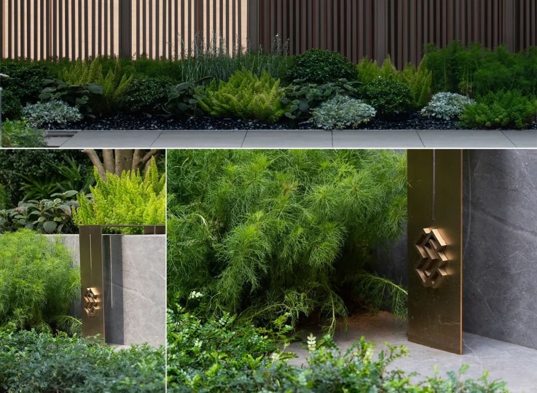 步道尽头,黑色的水幕墙无声地流趟着水的姿态,一棵造型优美的铁冬青摇曳生姿,极尽格调与意趣。精致的景墙与细腻的叠水结合形成视觉焦点,引导业主从视觉空间到心理感受上,从外部环境的繁华热闹“转场”为内部空间的品质宁静,营造秩序奢华的归家体验。