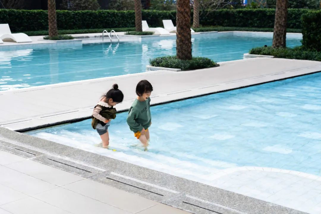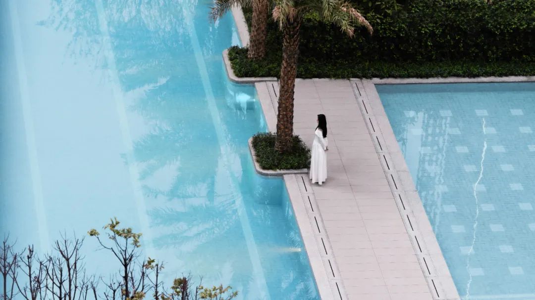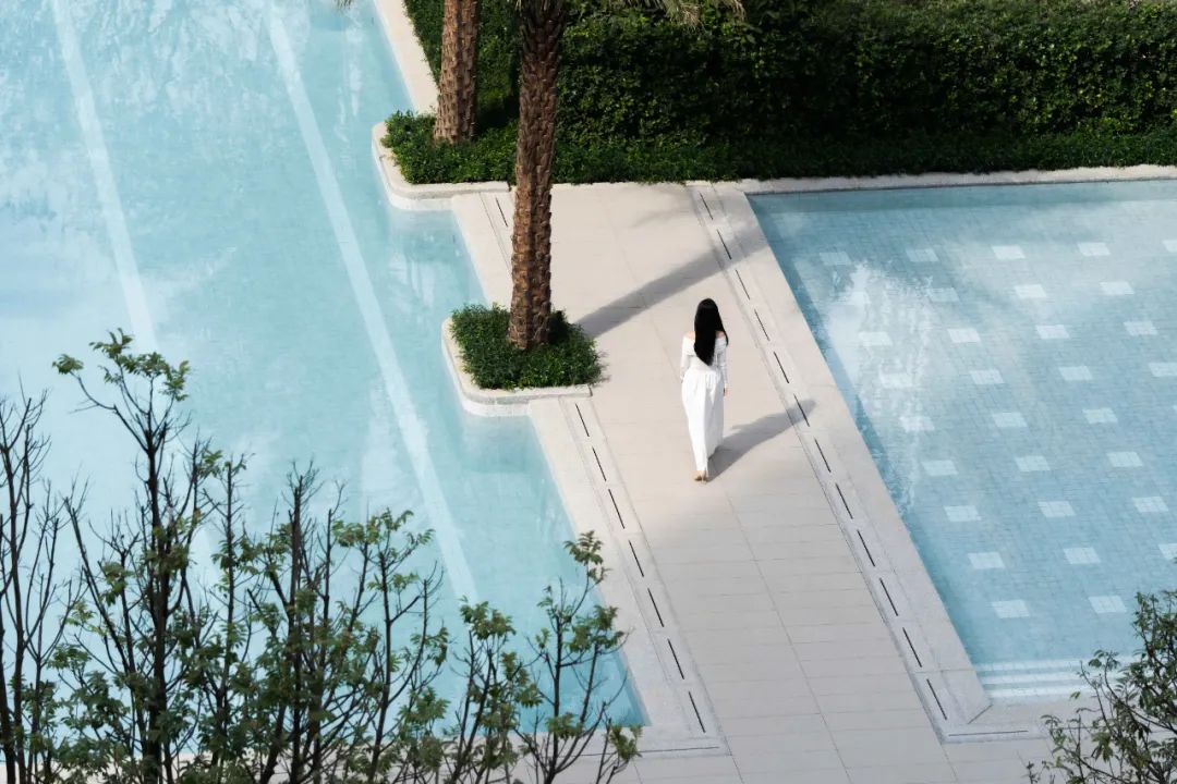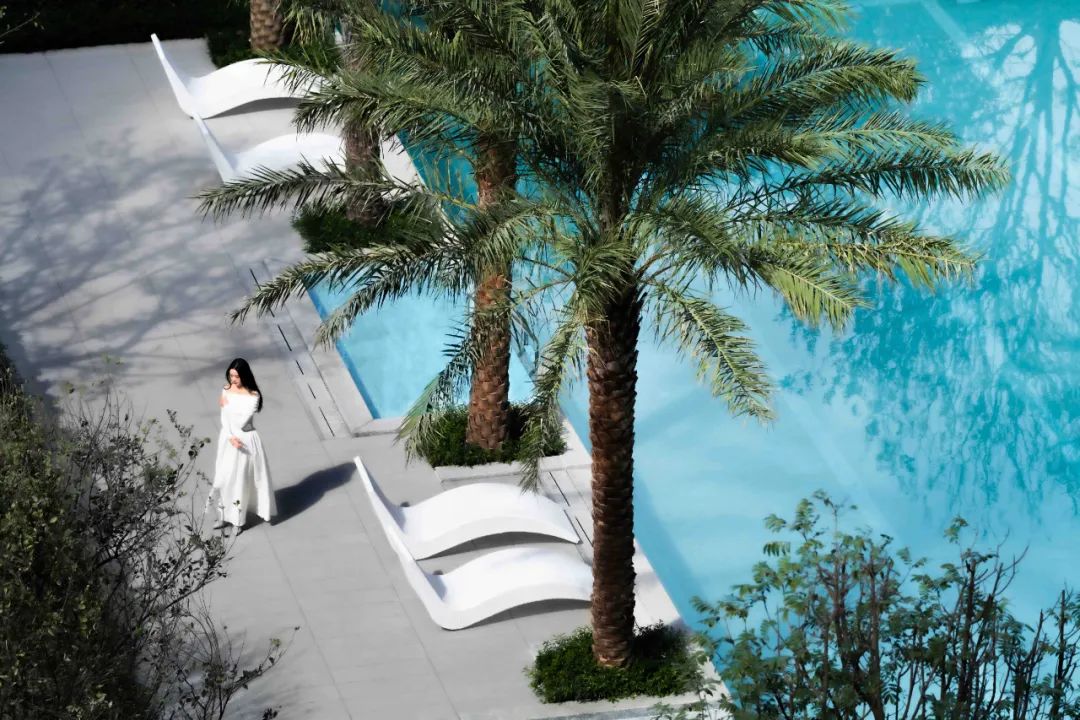 泳池选用仿大理石纹理的马赛克呈现Tiffany蓝的泳池效果,体现浓浓度假风情。
