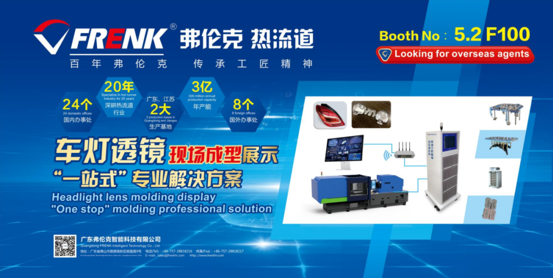 弗伦克热流道 位于本次展会模具及加工设备专区的核心展馆5.2馆中央主通道,占地一百多平方米。我们将推出车灯光学透镜的一次性成型的现场注塑,带来车灯,透镜、麻纤维注塑,双色、共注、渐变色,精密多腔等热流道先进成型技术。为所有模具注塑企业,解决产品快速换色,发黄发黑,提供“一站式”专业解决方案!