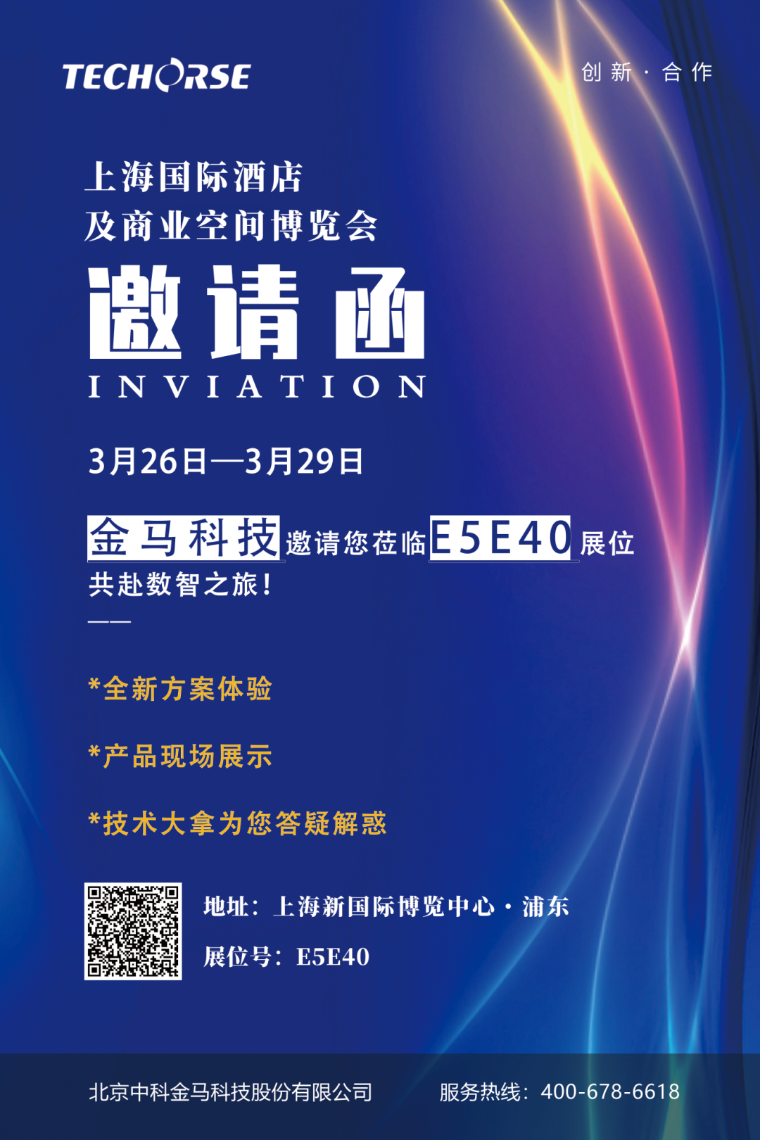 金马科技集约线束型智慧酒店解决方案、强电总线(G-PLC)型智慧酒店解决方案、强电总线(RS485通讯)型智慧酒店解决方案、无线通讯(蓝牙Mesh)型智慧酒店解决方案及众多新品亮相展会,更多信息,请莅临展位E5E40获取。