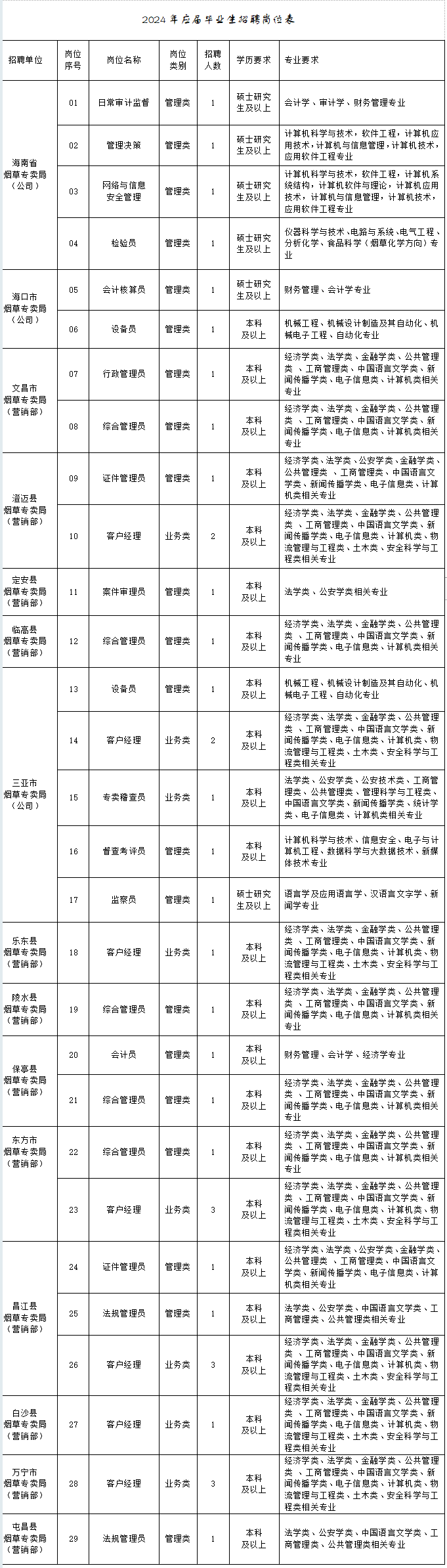 海南省烟草专卖局(公司)2024年度招聘公告
