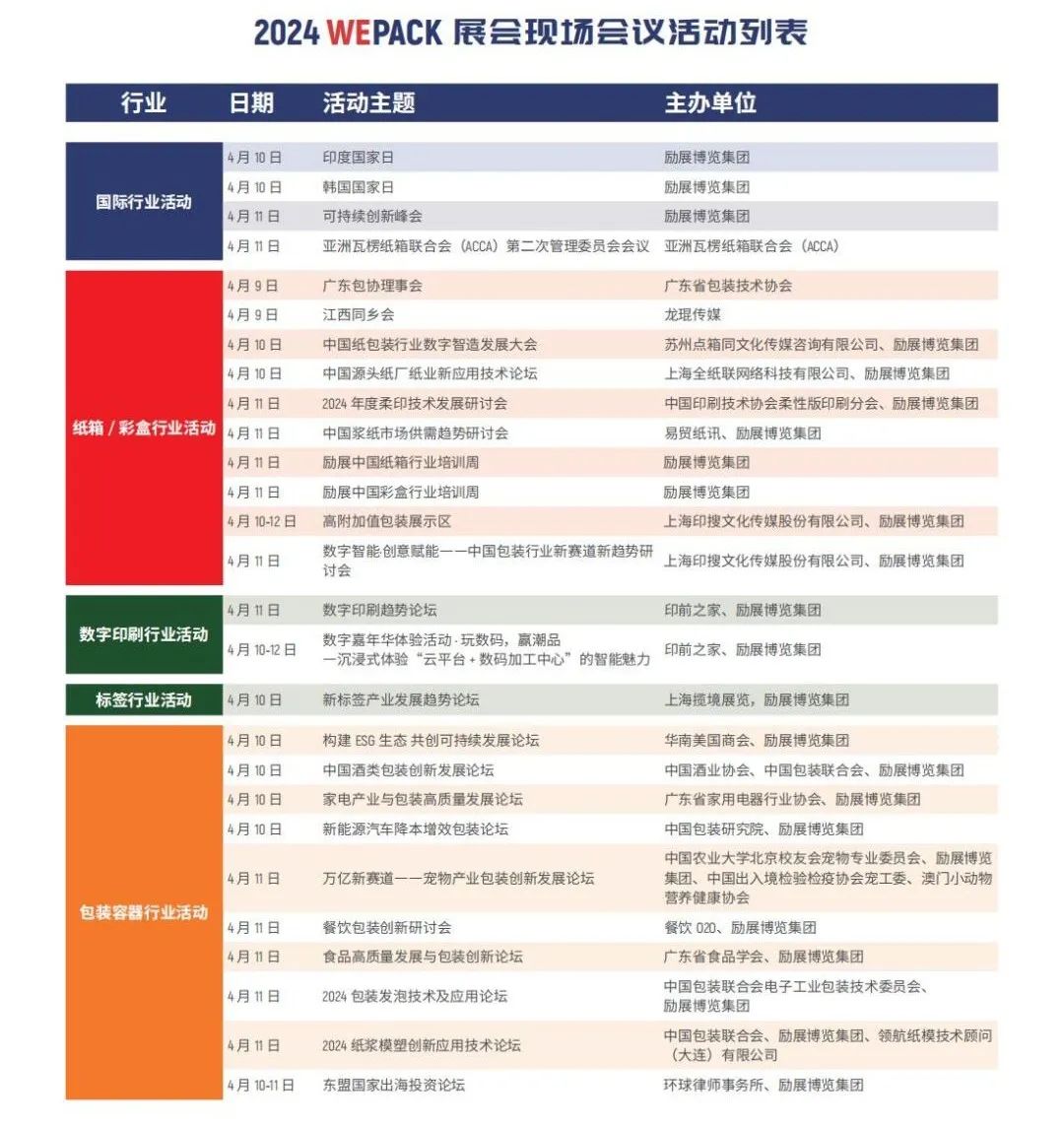本次WEPACK世界包装工业博览会汇聚了纸箱加工设备及材料、彩盒加工设备及材料、数字标签印刷设备及材料、包装容器生产企业、原纸生产企业、餐饮包装加工设备企业及材料商,那么,展会将会给我们带来什么样的惊喜呢?跟着纸箱侠一起去探索一下把!