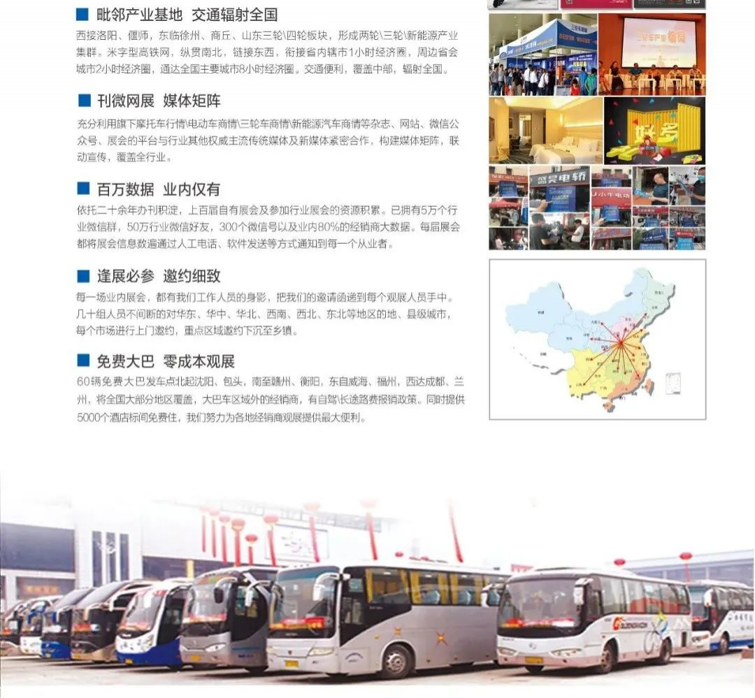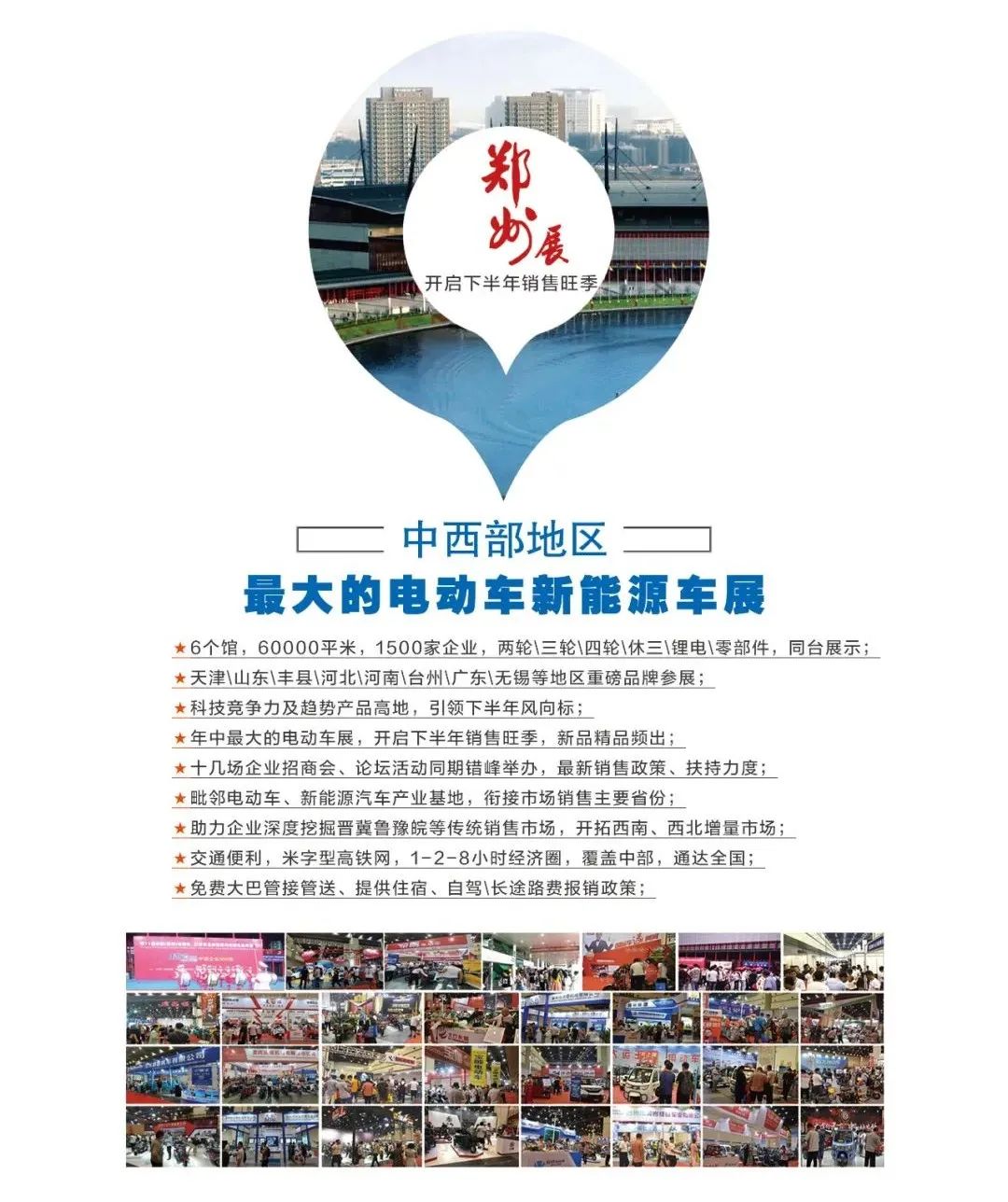 第16届中国(郑州)电动车、三轮车及新能源汽车展览会将于2023年7月在郑州国际会展中心举办!让我们齐聚郑州,共享商机,不负期待!2023郑州展不断扩增规模体量,将展会做大做强,将展示范围拓展至覆盖全产业链。同时,深入专研行业各版块,根据展品划分展厅,做到同类产品集中展示,形成集群效应,增强观众参观目的性。2023郑州展着重提高展会质量,重点邀请品牌企业到场参展。1500+展商 10000+展品 齐聚展会,展示企业发展新成果,彰显行业升级新风貌;为行业献上一场包罗万象、精彩绝伦的行业大展。本届展会同期准备十几场活动论坛,涵盖产业升级,渠道拓展、发展趋势、新品发布、行业预测等题材,让企业和经销商参与其中,深度沟通。郑州展依托公司20余年资深媒体,17年办展经验的资源数据优势,将观众邀约范围铺向全国,深耕晋冀鲁豫皖主要市场,拓展西南、西北,对经销商进行一对一邀约。充分利用郑州独特的区位优势及便利的米字型交通优势,本届展会对乘坐高铁、飞机、客车等长途交通工具的经销商,均提供补贴政策;对自驾经销商给予过路费报销政策;且均统一提供免费住宿。 本届展会整合业内主流新媒体、传统权威媒体资源,宣传途径涵盖网站、微信公众号、视频号、抖音号、快手、朋友圈、百度、今日头条等渠道,实现观众渠道全覆盖。并对展前展后全程跟踪报道,展会现场安排媒体现场采访,助力品牌宣传升级。第16届郑州展助力企业开启下半年销售旺季,与您共享商机,2023年7月与您相聚!