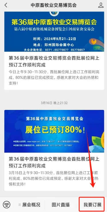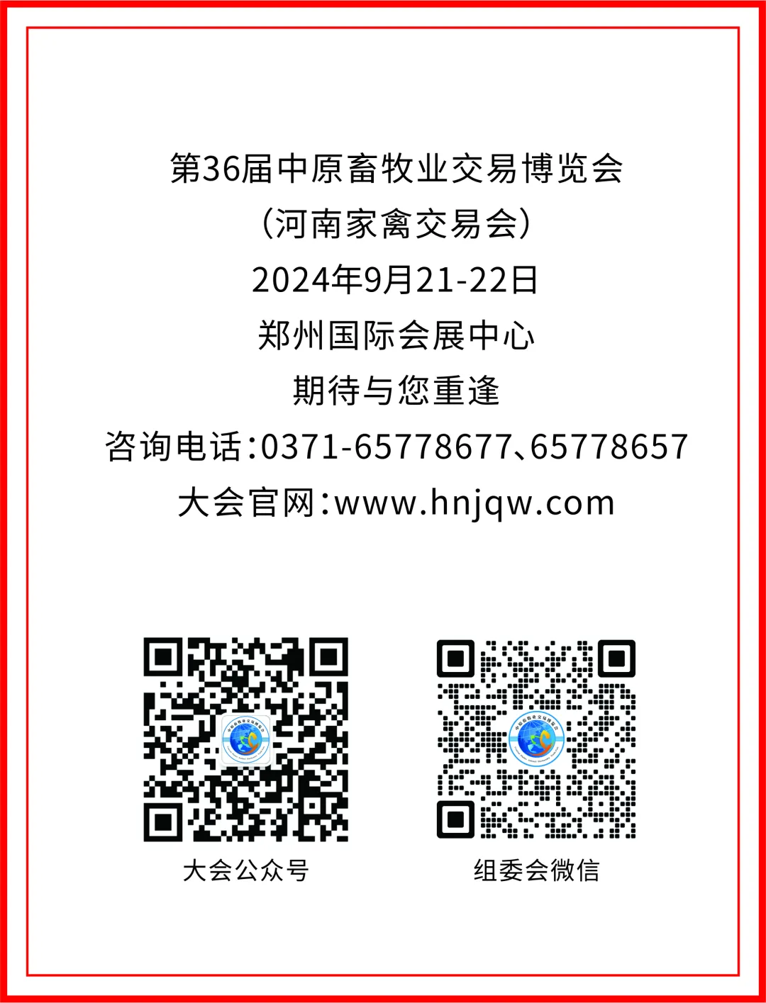 第36届中原畜牧业交易博览会(河南家禽交易会)将于2024年09月21-22日在郑州国际会展中心隆重举办,组委会各项工作已全面开展,展位预定持续进行中,可至大会官网www.hnjqw.com(订展入口)或大会微信公众号点击“我要订展”,也可微信搜索“中原畜牧业交易博览会订展系统”进入小程序预订展位,小程序与网站版订展系统数据完全同步,如已有账号可直接登录,无需重新注册。组委会联系电话:0371-65778677 65778657,微信:2942690082。