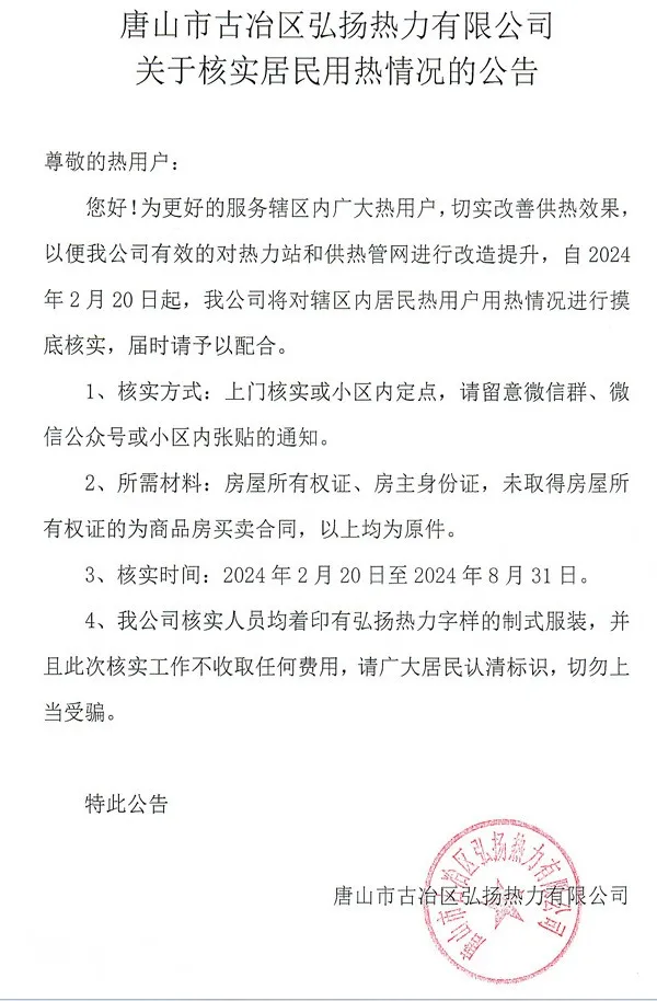 “春风得意马蹄疾”,迎着3月的春风,弘扬热力开展了供热面积核实工作。此次工作旨在夯实基础数据,摸清供热底数,更好的服务于古冶区弘扬热力全体热用户。他们身着统一服装,两两一组,深入到各个居民小区。截止目前,已累计完成唐家庄、南范各庄、吕家坨,三个供热区域的面积核实工作。我公司计划于本年度4月,进驻林西、赵各庄区域进行面积核实工作,请以上两个区域的居民,如遇我公司上门核实人员予以配合,再次感谢广大热用户对我公司此次工作的大力支持和理解!