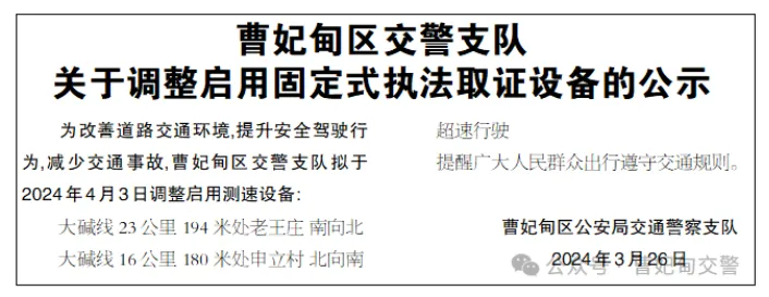 为改善道路交通环境,提升安全驾驶行为,减少交通事故,曹妃甸区交警支队拟于2024年4月3日调整启用测速设备:曹妃甸区交警支队