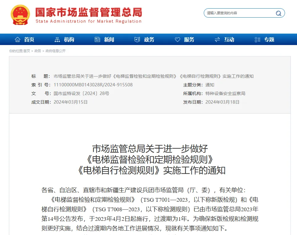 根据国家市场监督管理总局发布的《电梯监督检验和定期检验规则》(TSG T7001-2023)和《电梯自行检测规则》(TSG T7008-2023)要求,自2024年4月2日起,全国范围内全面实施电梯检验和自行检测新规。