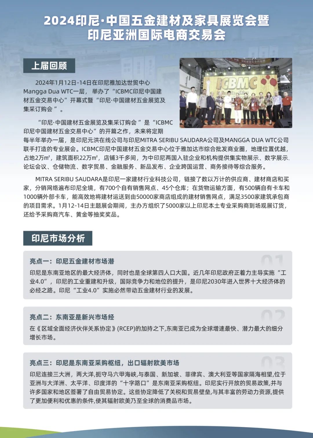 印尼·中国建材五金集采订购会将在印尼雅加达世贸中心隆重举行。我们特设五天参会及当地市场考察行程,诚邀您一同领略印尼建材市场的魅力,探寻五金行业的无限商机。