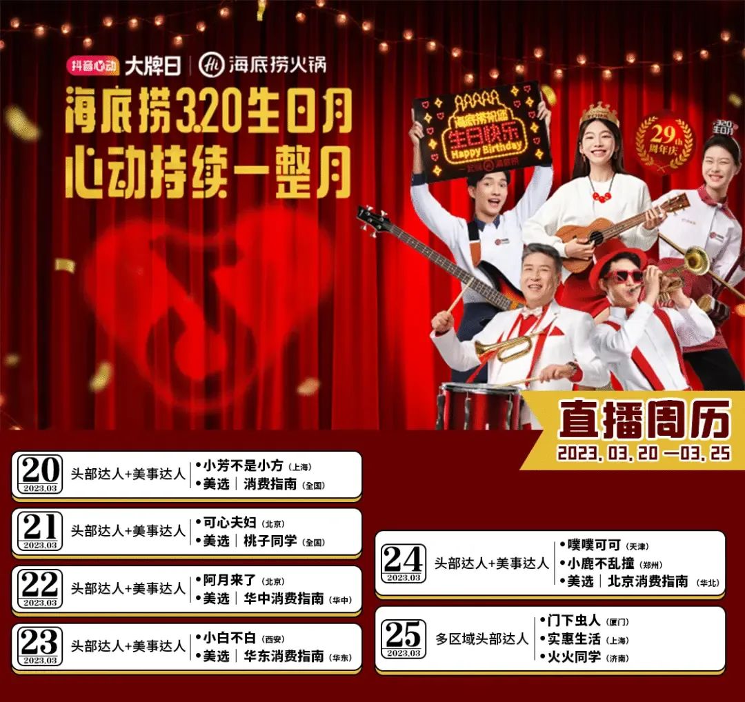在机构主播方面,海底捞与抖音本地生活头部 MCN 机构美图美事合作,邀请的带货主播既有面向全国的网红,还有按区域划分,重点聚焦某个城市的博主。
