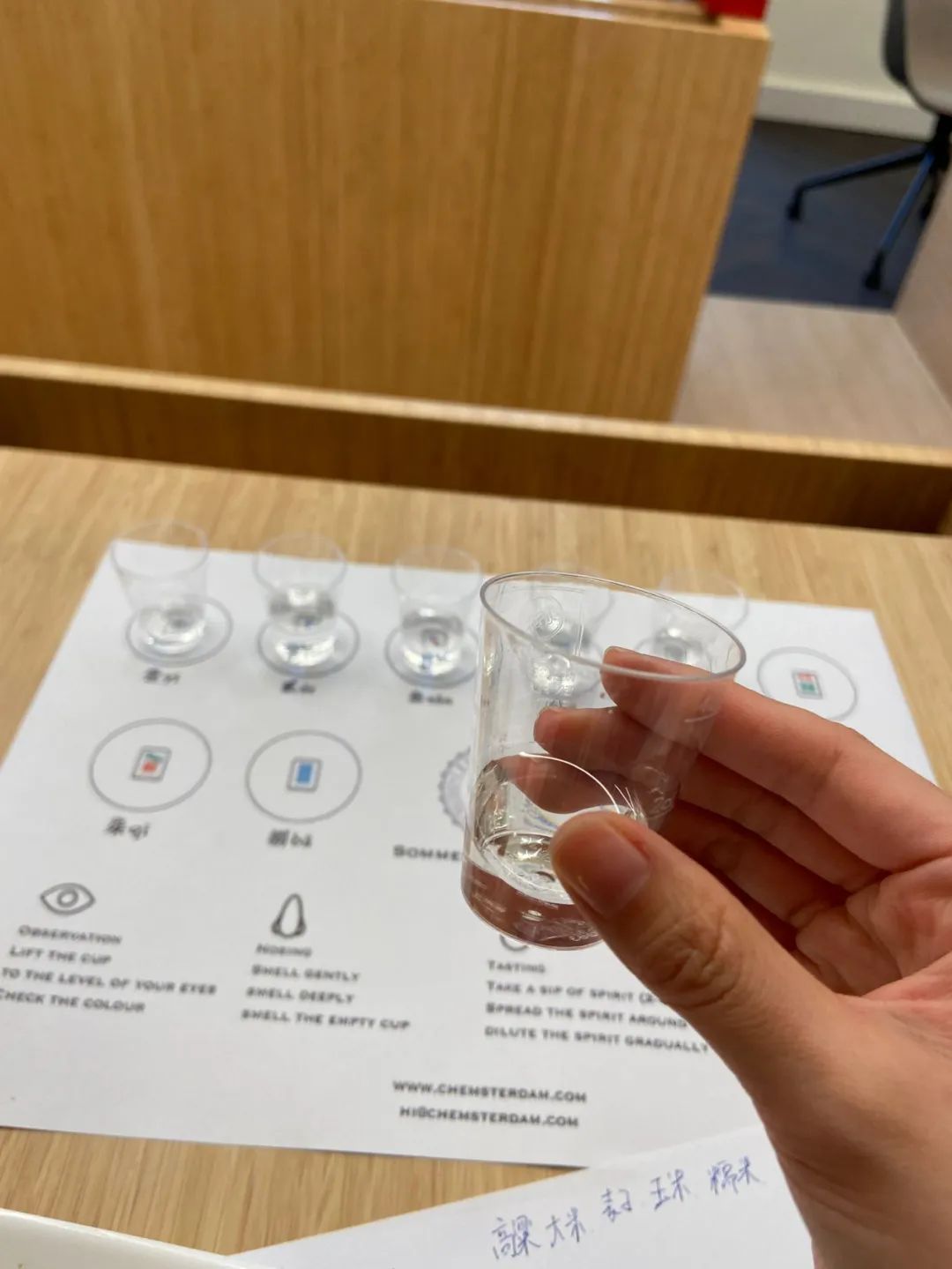 在本次活动的最大亮点——酒的品鉴环节中,伍先生悉心引领大家对甜香、陈皮肉桂八角香、茴香、烟熏、果香和酱香六款不同类型的烈酒进行了观色、闻香、浅尝,讲授这六款来自不同国家的酒背后的故事。值得一提的是伍先生以自己的家乡——四川成都著名的麻将元素为灵感设计了本次活动的桌垫,让整个品鉴活动充满浓浓的中国味儿。随着伍先生的讲授,大家一起仔细观察酒液的色泽与流动,轻嗅酒香中蕴含的丰富层次,细细品味着每一款酒所带来的独特口感与风味,仿佛穿越时空,置身于古老的酿酒工坊之中,感受着中华白酒文化的深厚底蕴与独特魅力。