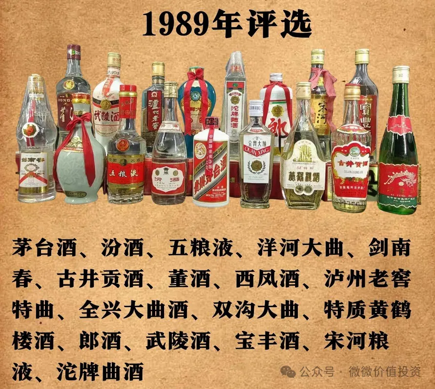 1989年,在合肥举办的第五届全国评酒会,也是最后一届全国评酒会,共评出了茅台酒、汾酒、五粮液、洋河大曲、剑南春、古井贡酒、董酒、西凤酒、泸州老窖特曲、全兴大曲酒、双沟大曲、特制黄鹤楼酒、郎酒、武陵酒、宝丰酒、宋河粮液、沱牌曲酒共十七种名酒。与此同时,在这十年里,随着白酒研究的逐步深入,白酒的香型矩阵也逐渐完善,从原先的四大香型逐渐扩展为包括清香型、浓香型、酱香型、米香型、凤香型、药香型、豉香型、芝麻香型、特香型、老白干香型、兼香型、馥郁香型共十二大香型。