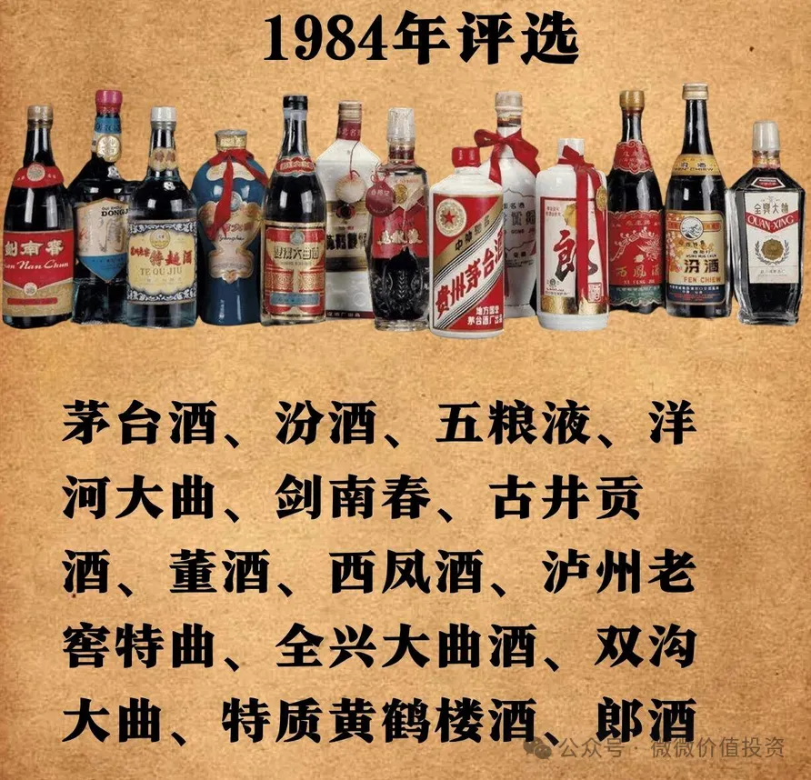 1963年,第二届评酒大会在北京举行,评选出“老八大名酒”,分别是五粮液,古井贡酒,泸州老窖特曲,全兴大曲酒,茅台酒,西凤酒,汾酒,董酒。