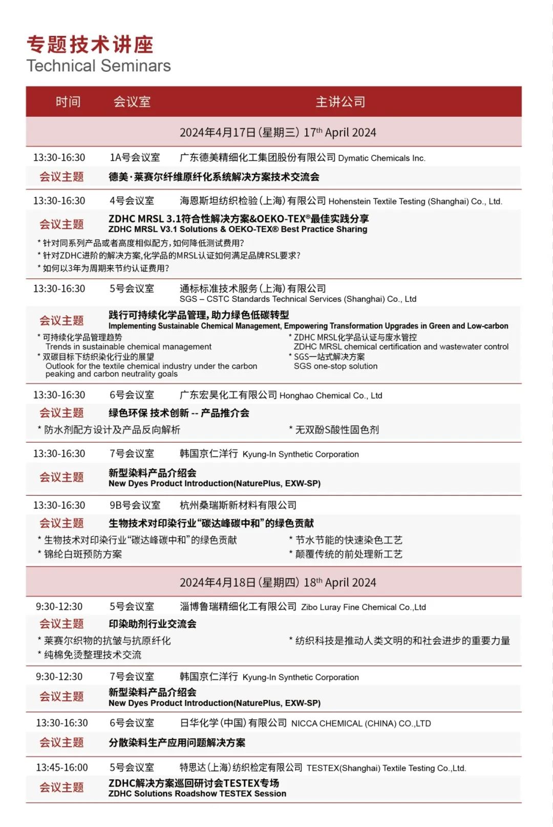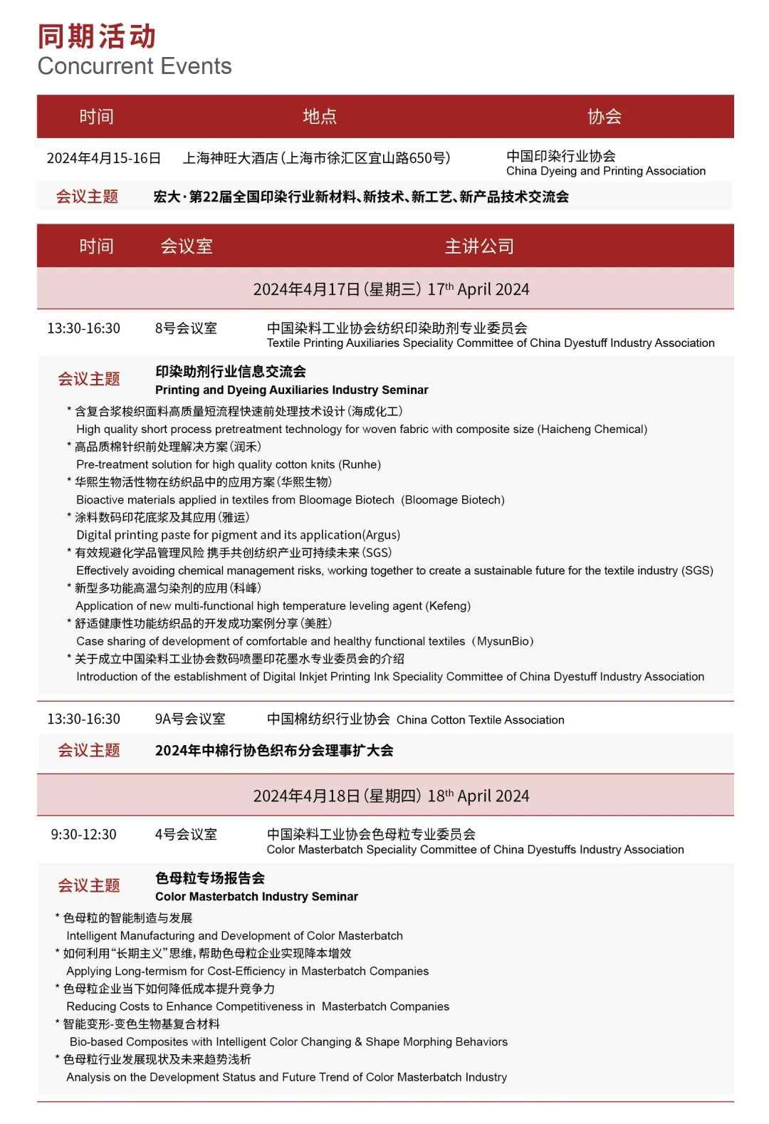 展会同期,中国印染行业协会、中国棉纺织行业协会、中国染协助剂专委会、色母粒专委会等众多行业协会将举办配套论坛,展会同期呈现14场技术交流会和活动,内容涵盖各类先进技术及工艺、市场动态趋势和新发展理念、双碳背景下绿色发展途径等内容,将为更多专业观众提供绝佳的交流与合作机会。