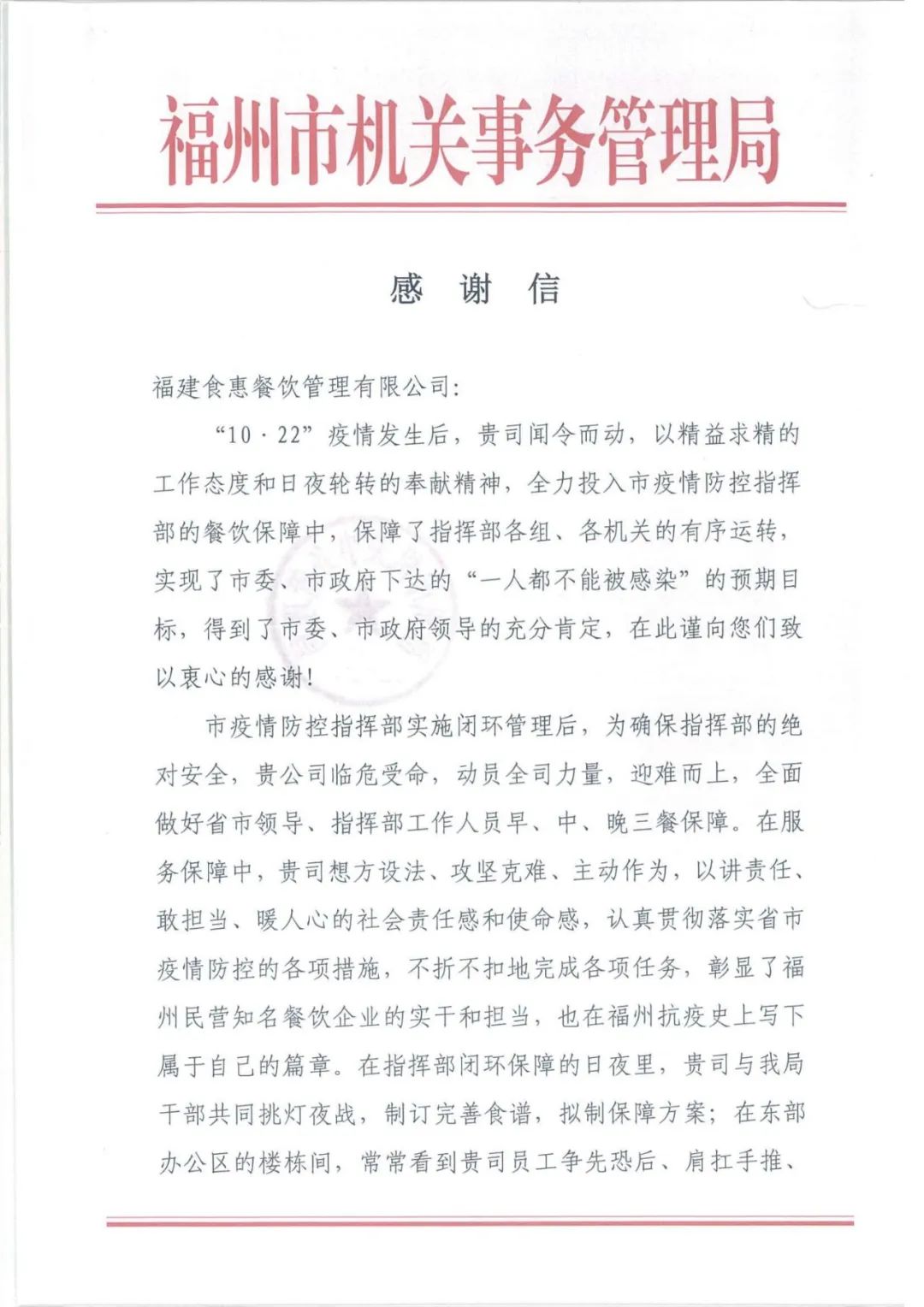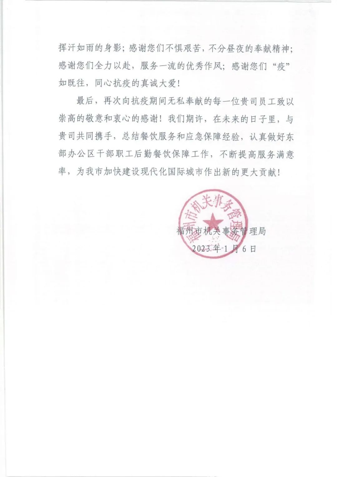 张炜鸣表示,食惠餐饮入驻福州市直机关东部办公区7个多月以来,在各方面给予机关事务局大力支持,负责保障的第二食堂就餐率和好评率都实现较大提升。尤其是“1022”疫情期间,食惠餐饮克服困难,以日夜轮转的奉献精神,为东部办公区以及相关闭环管理人员提供了强有力的餐食保障,得到了广大干部职工的普遍赞誉。希望食惠餐饮坚定信心、开拓视野、勇于创新,在新的一年以更高标准做好东部办公区餐饮保障工作,努力创造更优业绩。