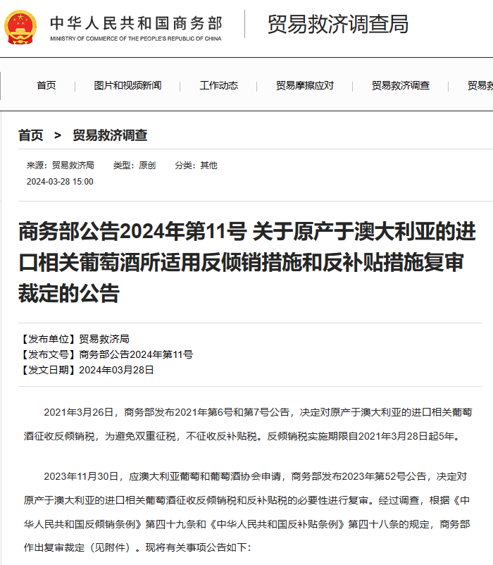 2021年3月26日,商务部发布2021年第6号和第7号公告,决定对原产于澳大利亚的进口相关葡萄酒征收反倾销税,为避免双重征税,不征收反补贴税。反倾销税实施期限自2021年3月28日起5年。